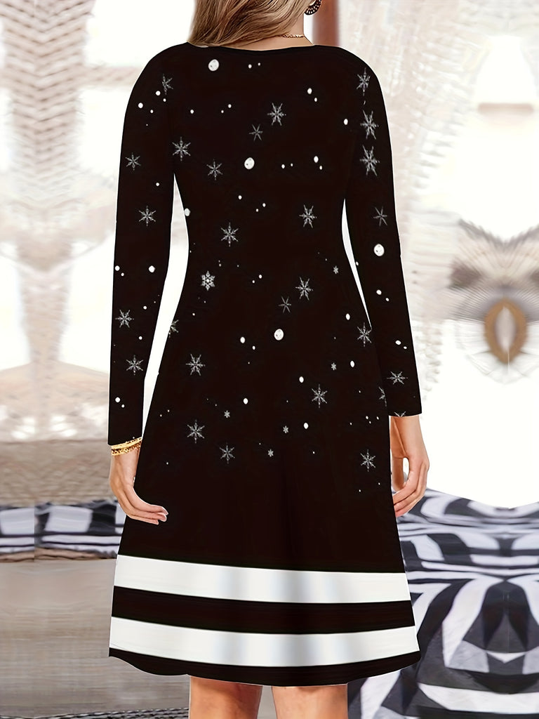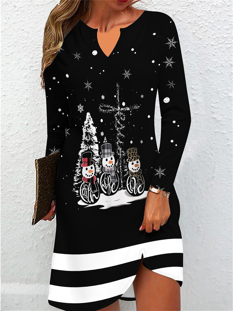 Women's Christmas Themed 3D Print V-Neck Long Sleeve Dress - Casual Polyester Knit Fit Dress with Snowmen and Christmas Tree Design for Adults - Autumn/Winter Collection