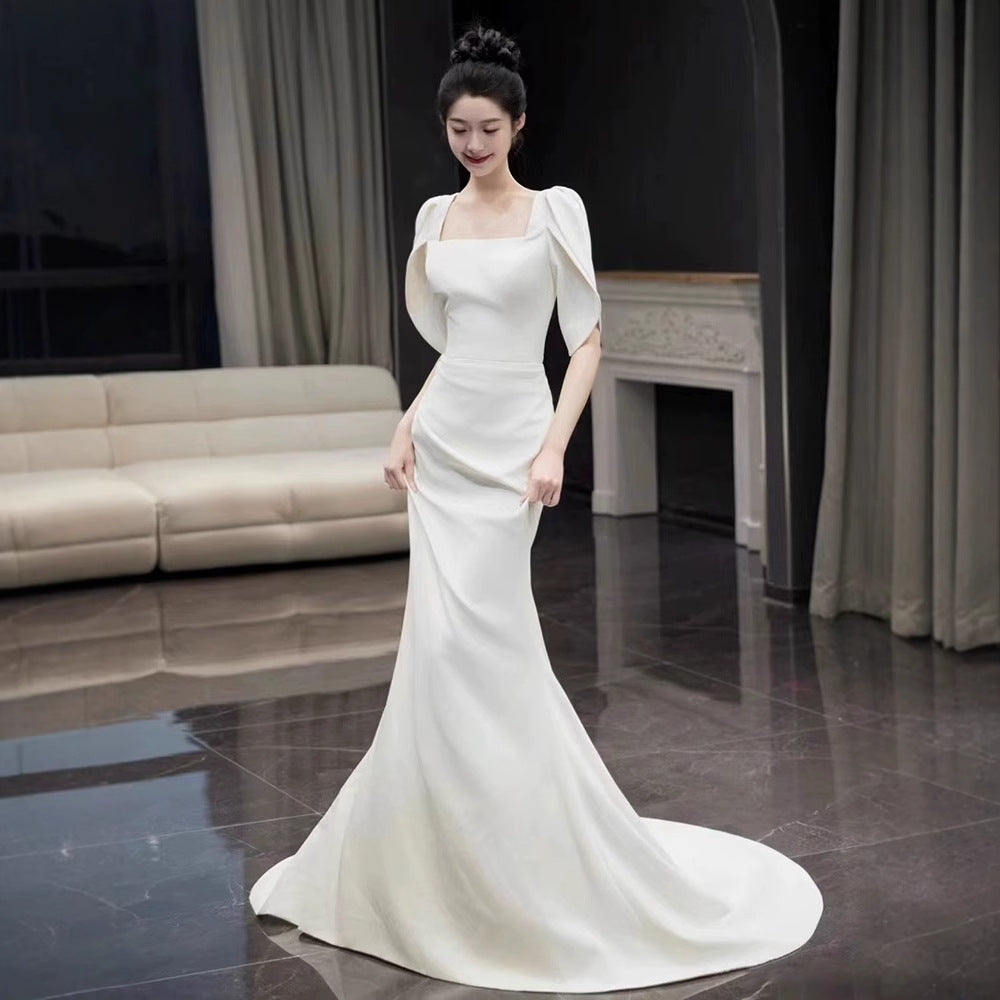 2025 Fish tail satin light wedding dress simple Korean Mori super fairy engagement dress white square neck door yarn covering thick arms
