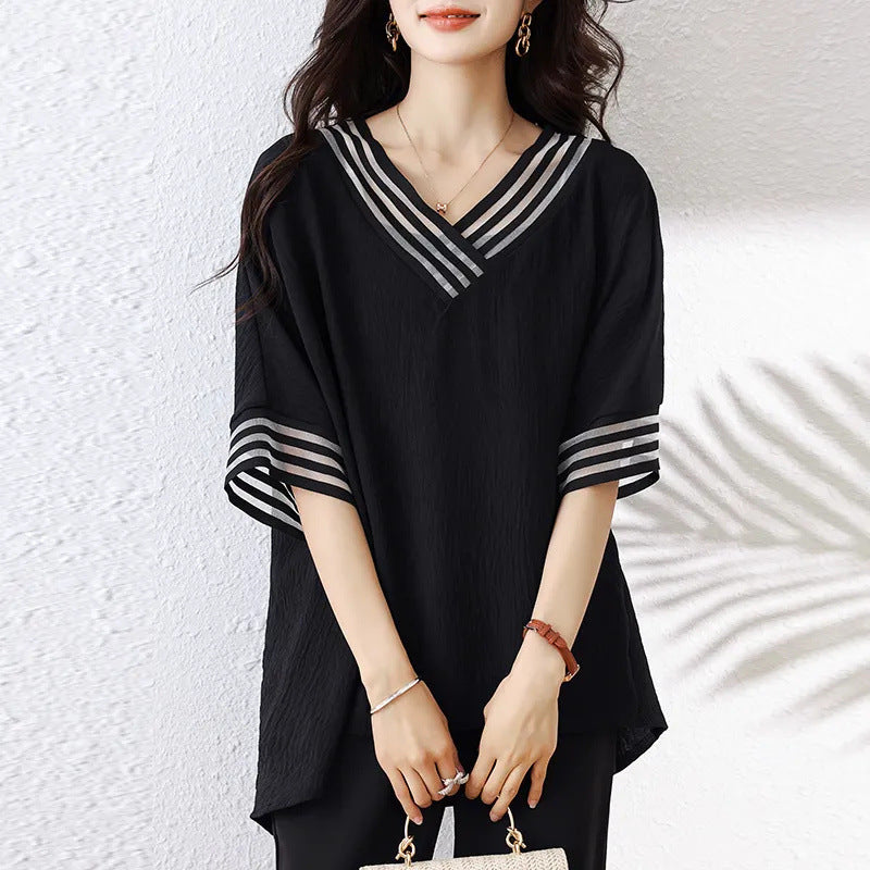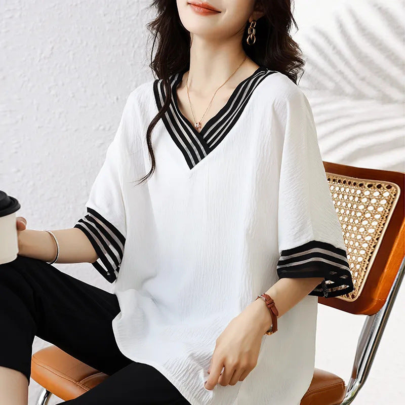 Large size summer V-neck splicing loose medium-sleeved top, fat mother covering meat and showing thinness and reducing age, high-end casual women's T-shirt