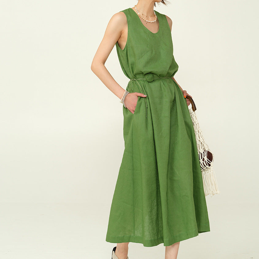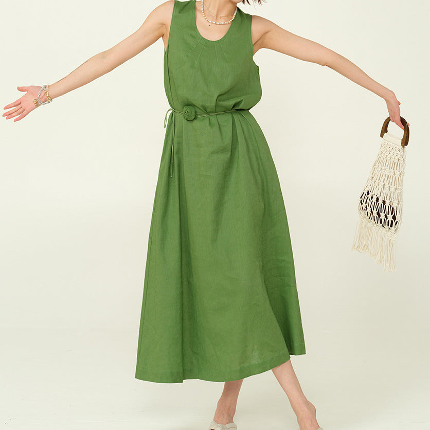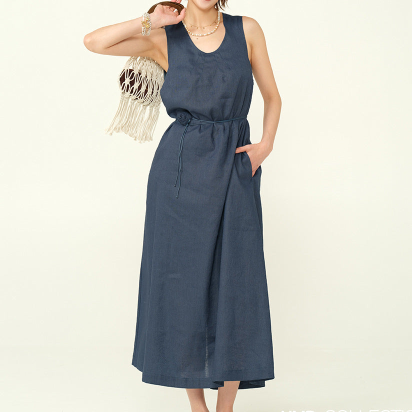 2025 25 spring and summer handmade rose U-neck casual lazy long dress minimalist loose and thin A version vest linen dress women