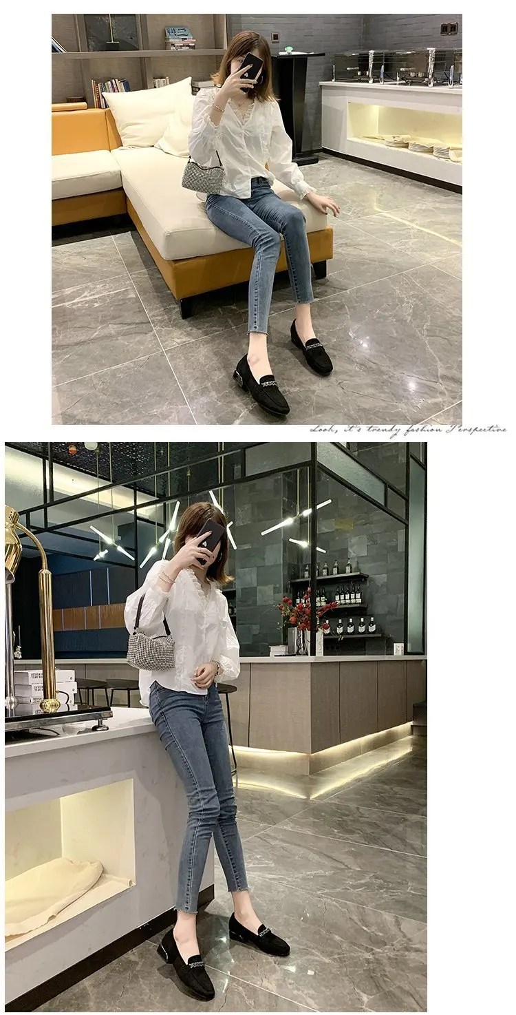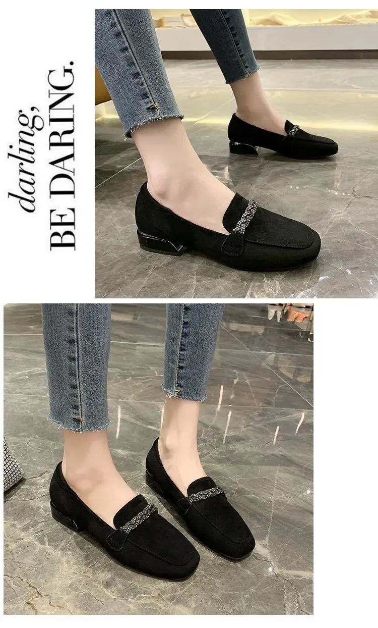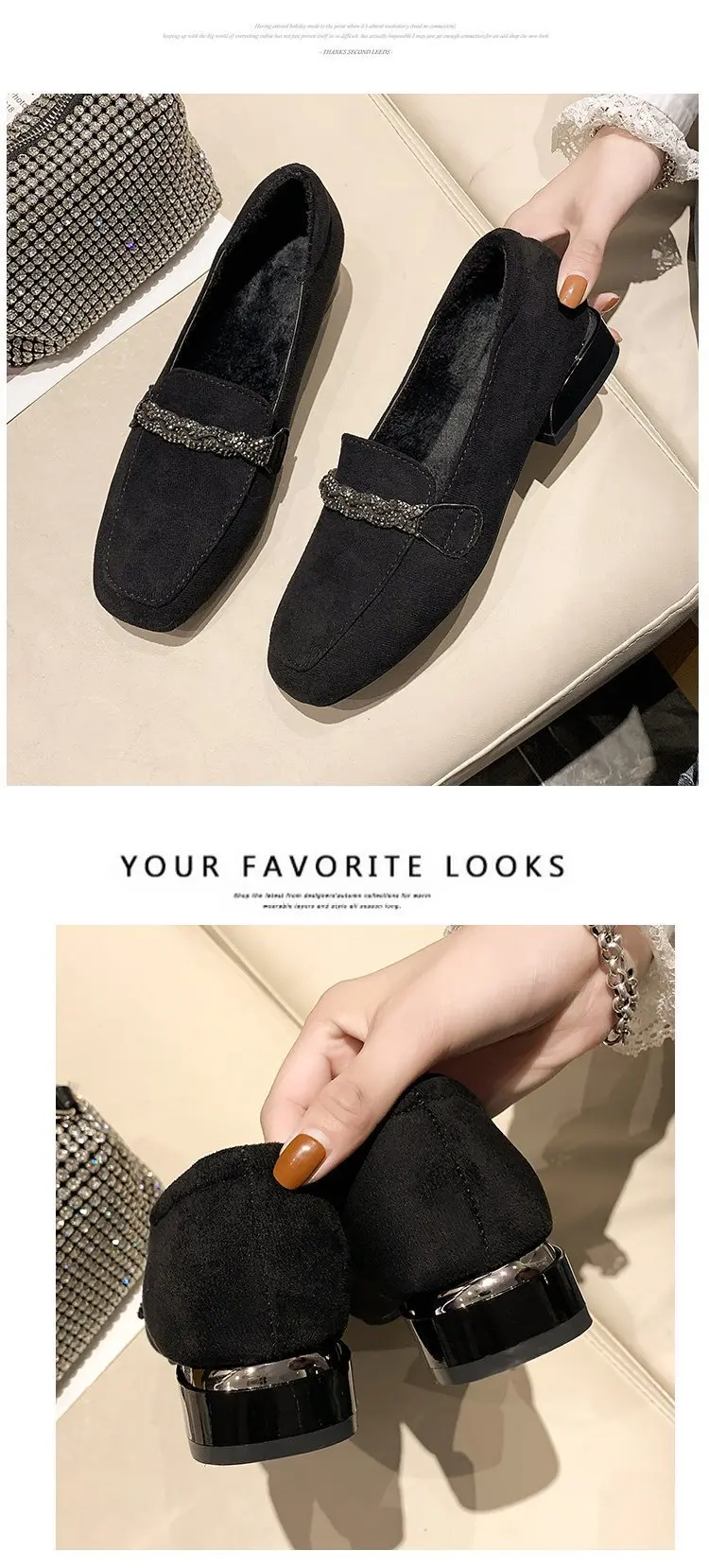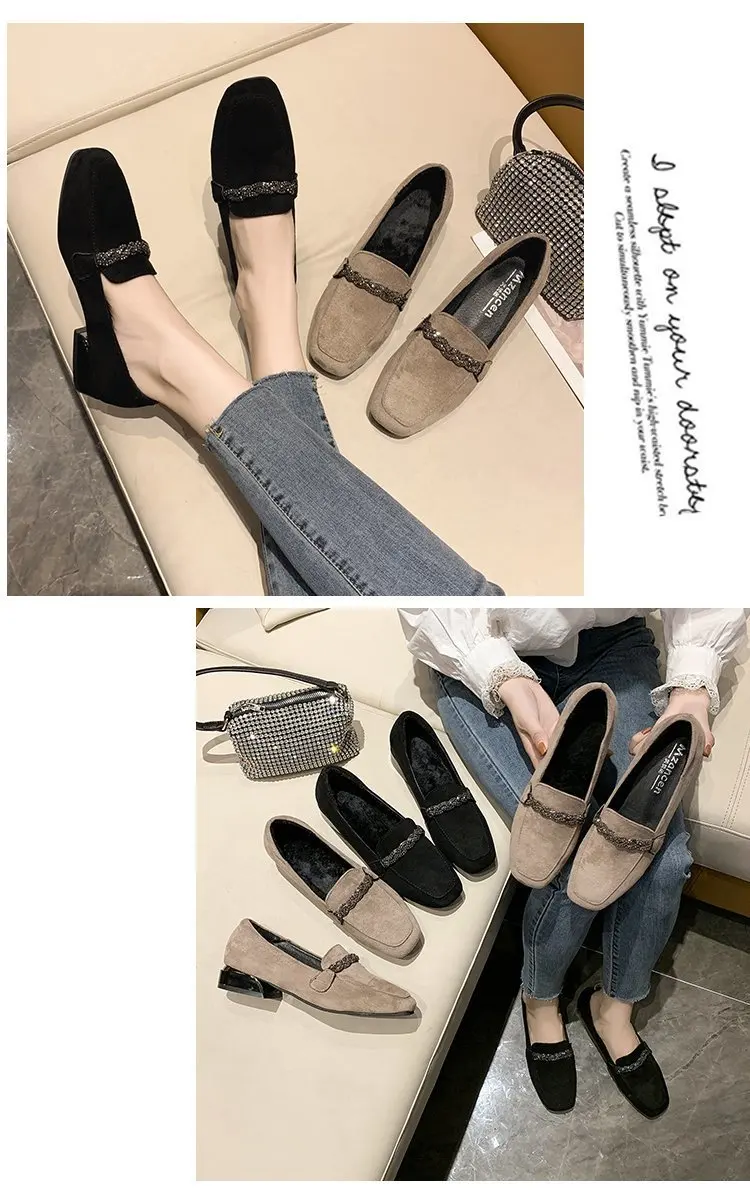 hulianfu Autumn Winter Women Loafers Low Heels Boat Shoes Square Toe Dress Shoes Chain Faux Suede Plush Warm Ladies Shoes Plus Size