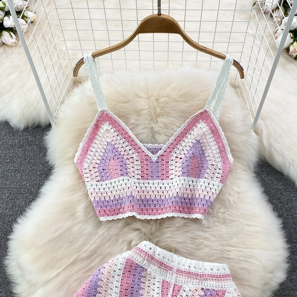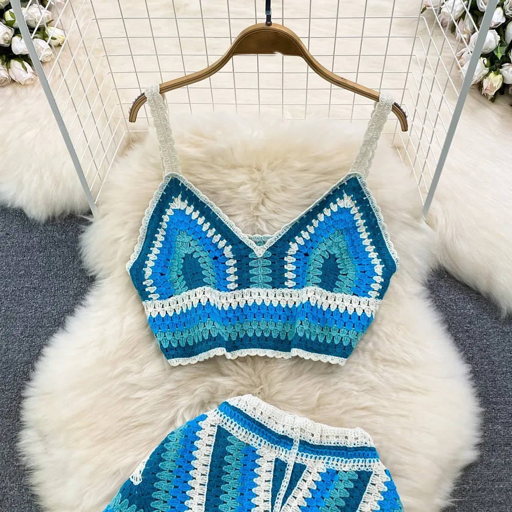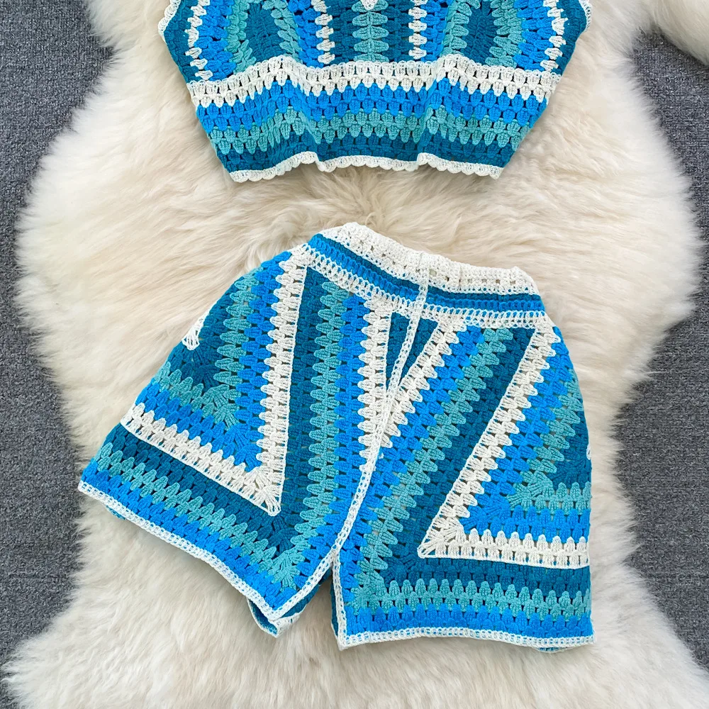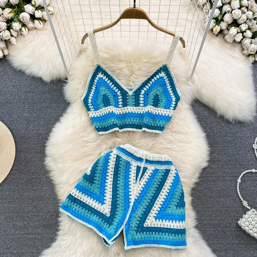Knitted Crochet Two Piece Set Women Sexy V-Neck Cropped Tank Top and High Waist Shorts Matching Summer Beach Outfits
