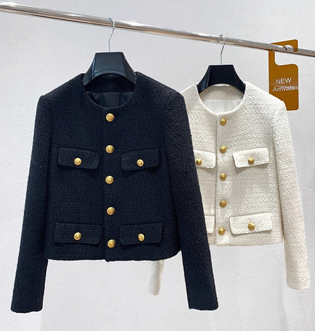 Hulianfu Small Fragrance Women Black Tweed Outerwear Autumn Winter Golden Button Blends Wool Female Long Sleeve Jacket Coat