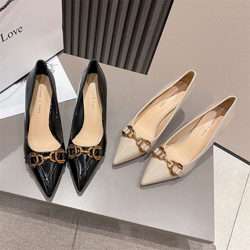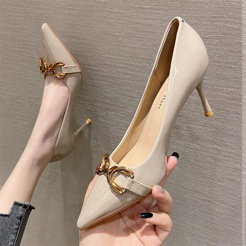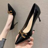 2025 775-26 commuter high-heeled single shoes women's Korean version professional patent leather high-heeled shoes horse buckle pointed stiletto women's shoes