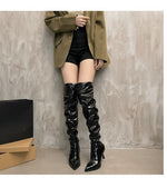 2025 Black pleated stacked boots women's shoes popular autumn and winter new thin heel high heel sleeve knee boots small man
