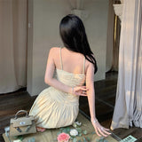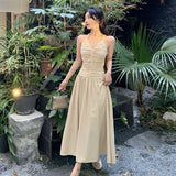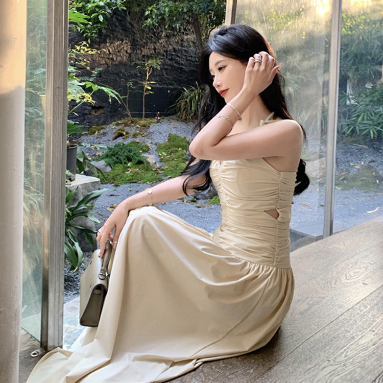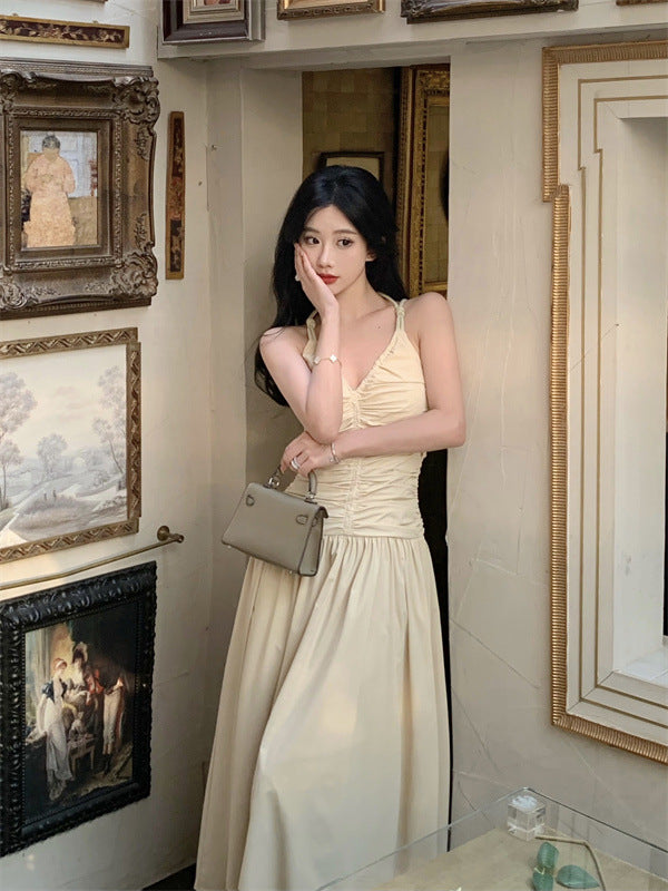 2025 neck V-neck suspender dress women's spring and summer temperament waist pleated A-shaped skirt vacation style medium and long skirt
