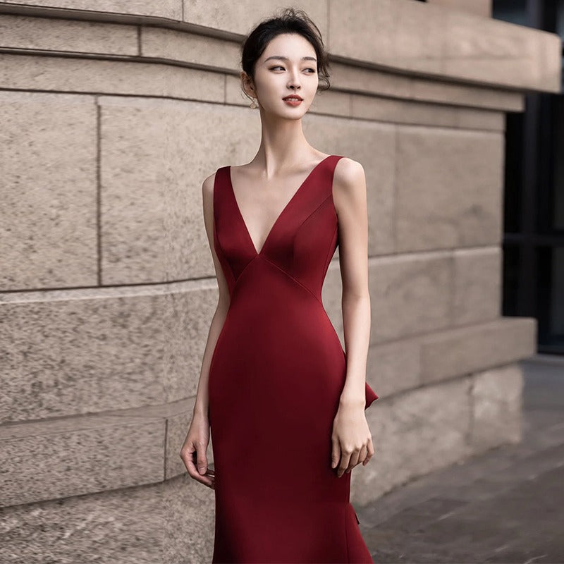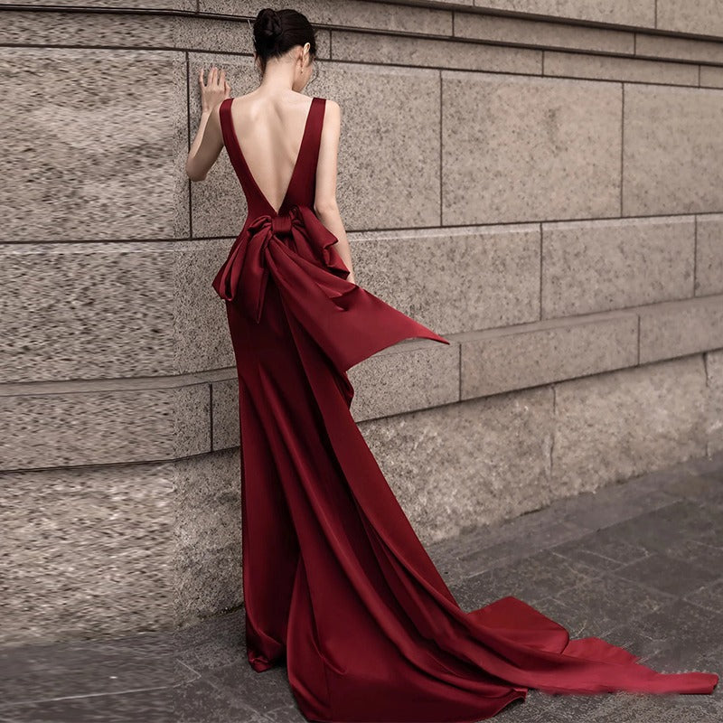 2025 Premium satin toast dress sexy deep V art exam host long dress temperament thin bride wedding fishtail evening dress
