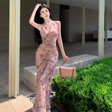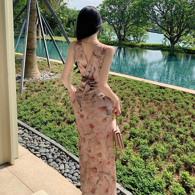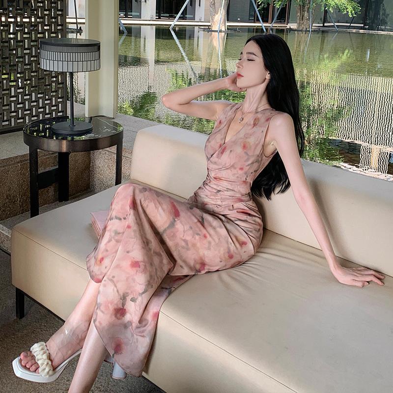 2025 retro oil painting rose print V-neck sleeveless dress women's 2025 summer high waist and thin coffee break dress