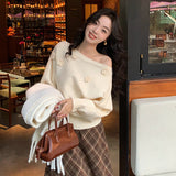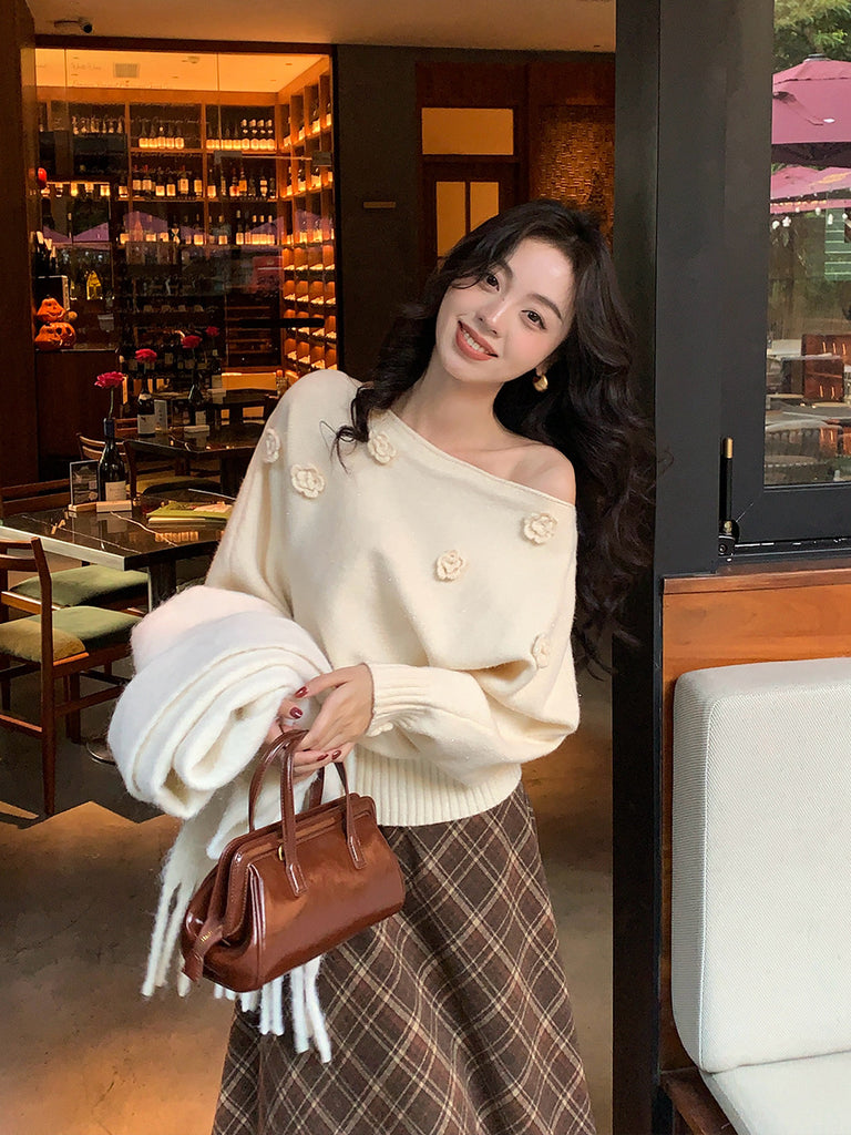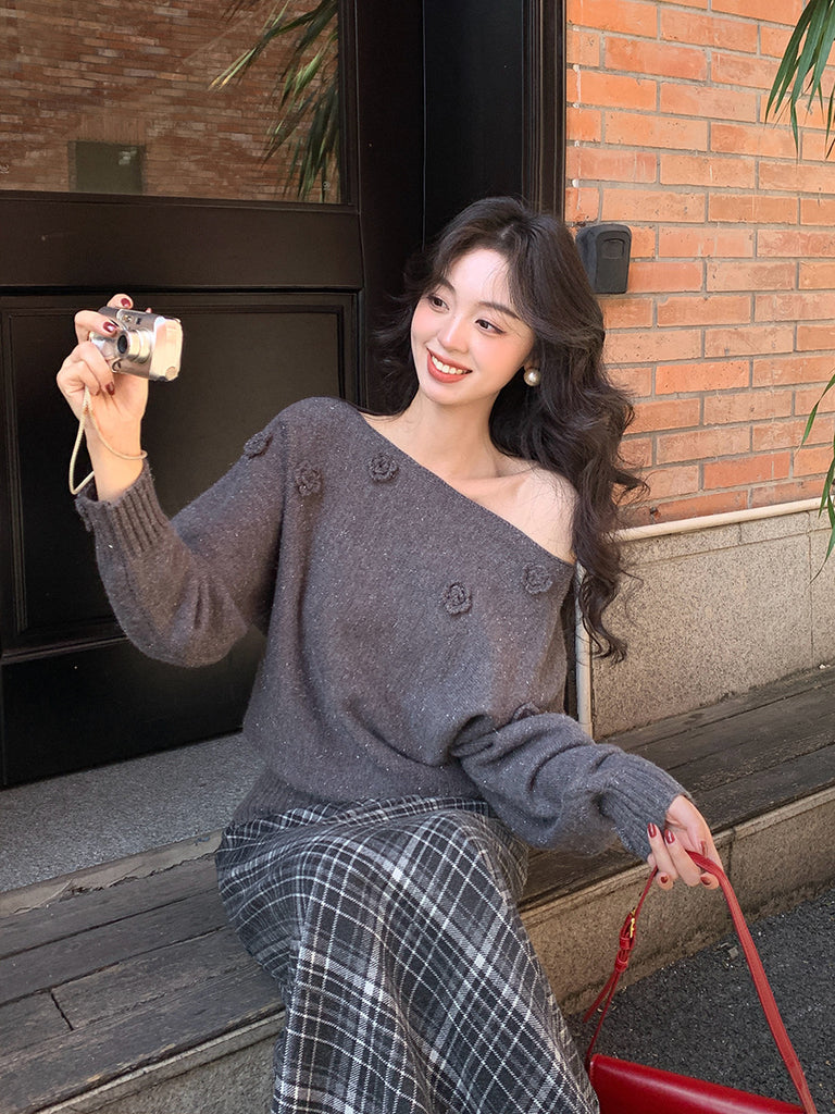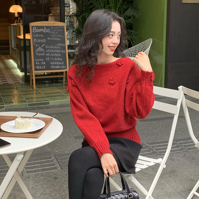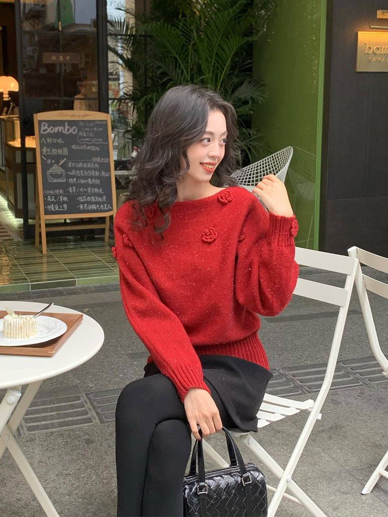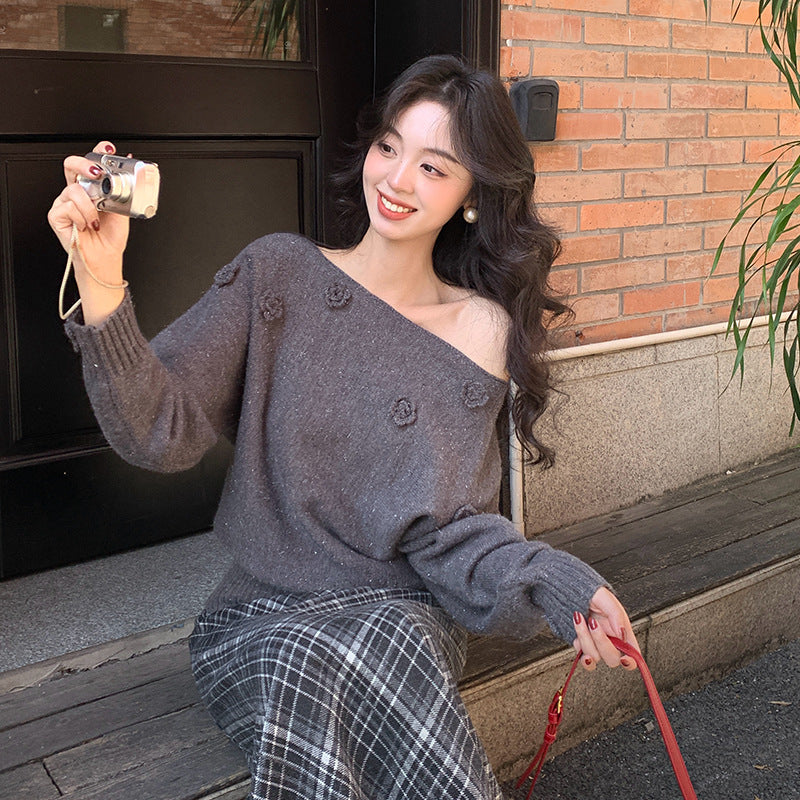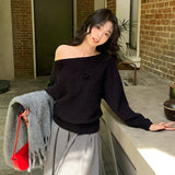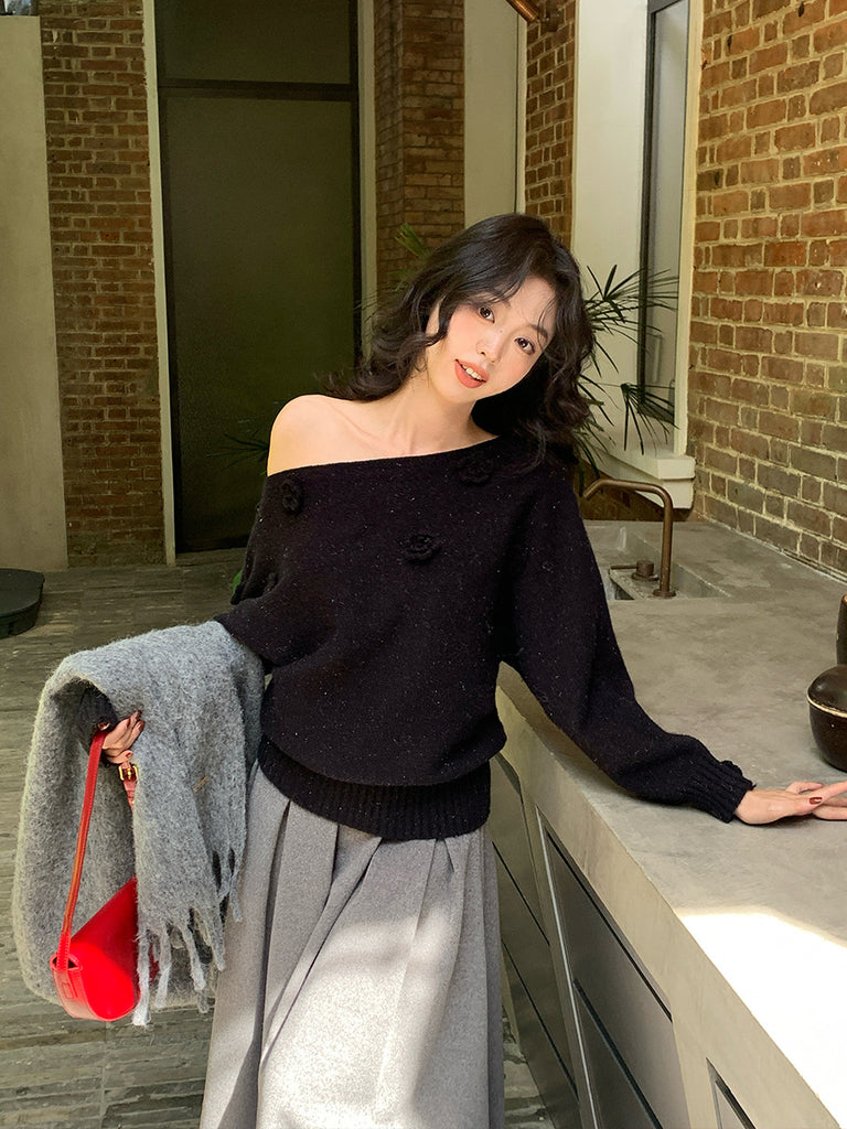2025 Thirteen Lines popular Autumn and Winter New Temperament ins Rose Off-Shoulder Knitted Sweater Versatile Top Women 25179