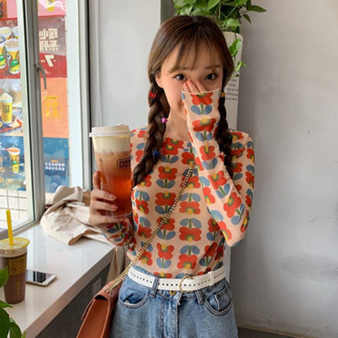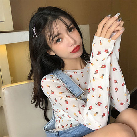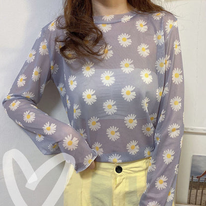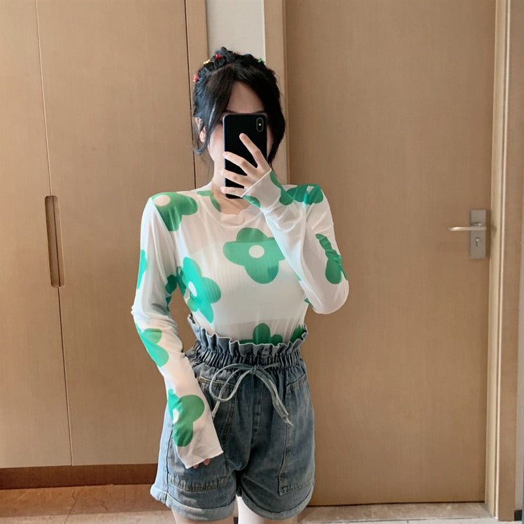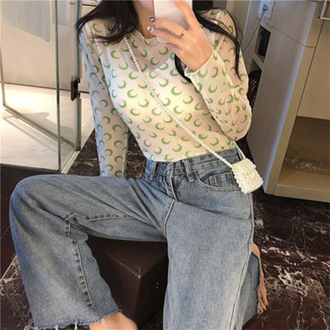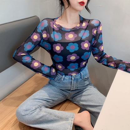 Hulianfu Angel Print Sheer Blue Black Mesh Long Sleeve Blouse Shirts Women Spring Summer Pullovers Elegant Sexy See Through Tops