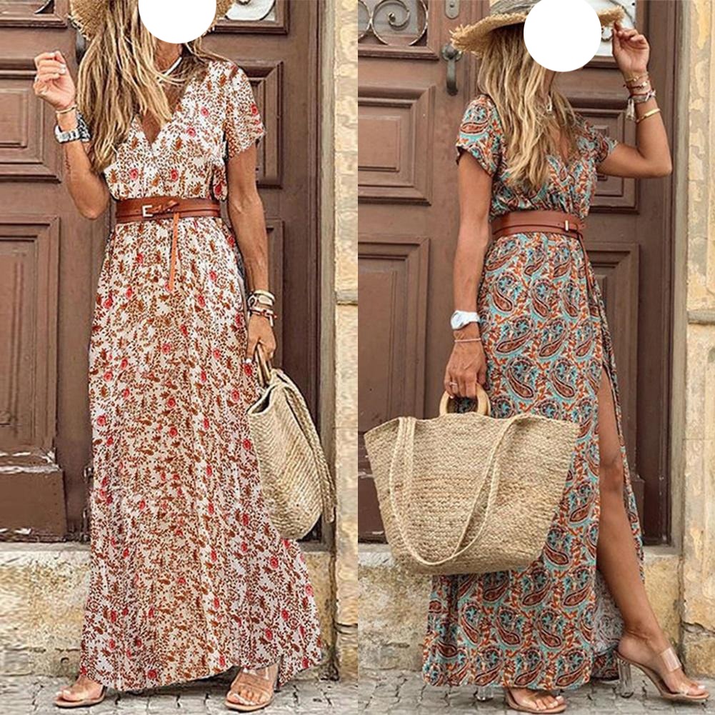 Fashion Boho Dress Long Dress Women Casual V Neck Short Sleeve Retro Print Belt Hem Beach Dresses Elegant Sundress Robe Femme