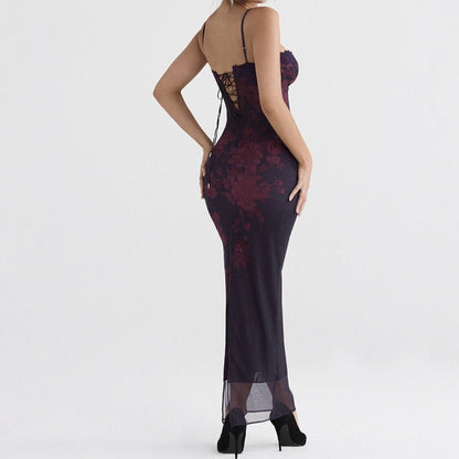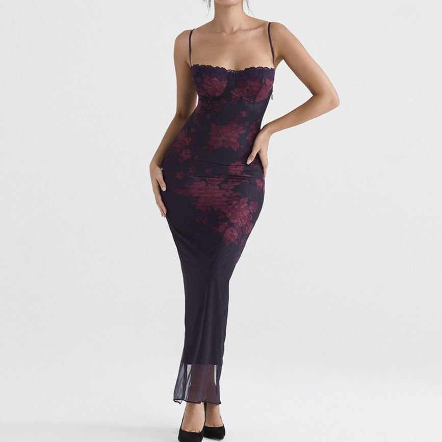 Hulianfu Floral Print Maxi Prom Dress Sexy Mesh Celebrity Evening Party Dresses Bodycon Spaghetti Strap Summer Women Dresses
