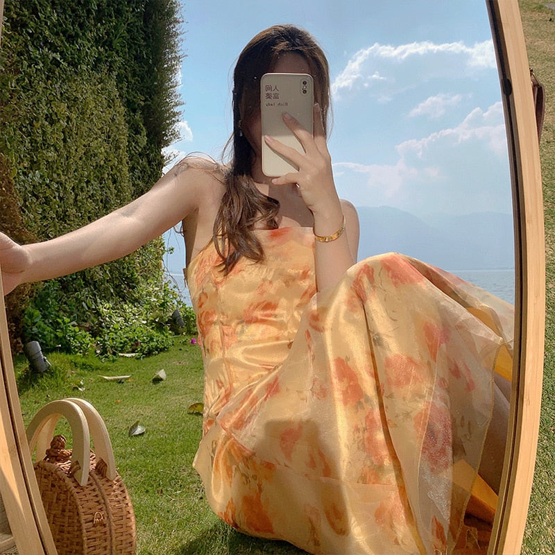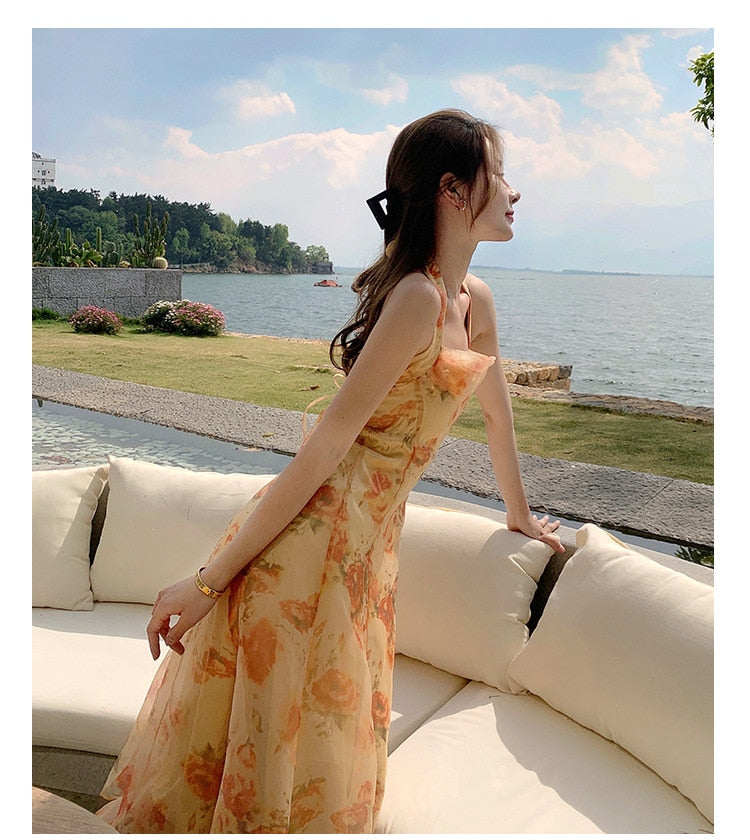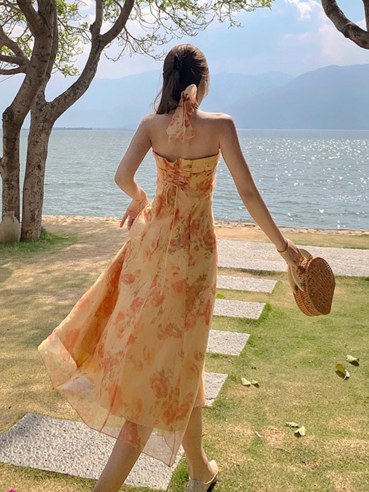 Hulianfu French Vintage Dress Women Elegant Backless Floral Halter Neck Midi Dress Summer Chiffon Holiday Beach Dresses for Women