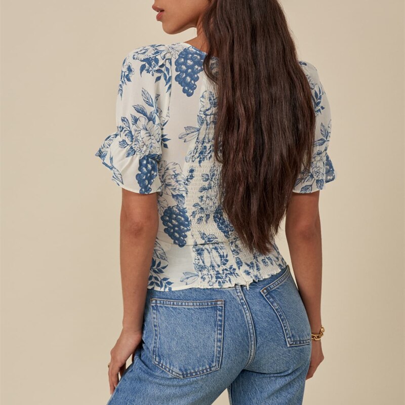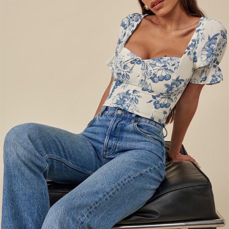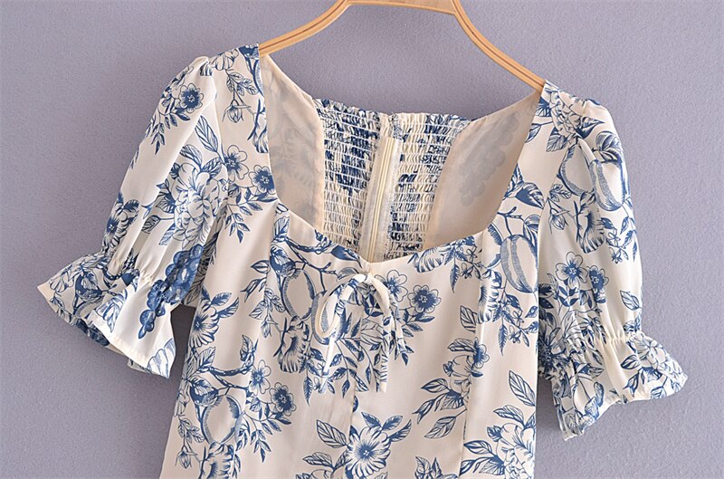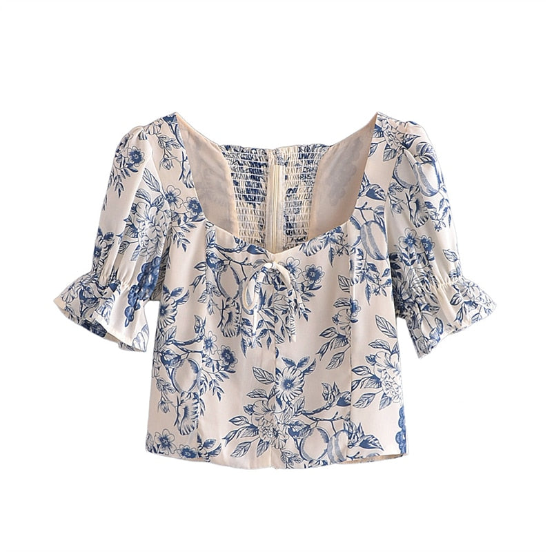 Hulianfu French Vintage Square Collar Puff Sleeve Folds Lace-Up Shirt Zipper Female Floral Print Summer New Fashion Crop Tops Women