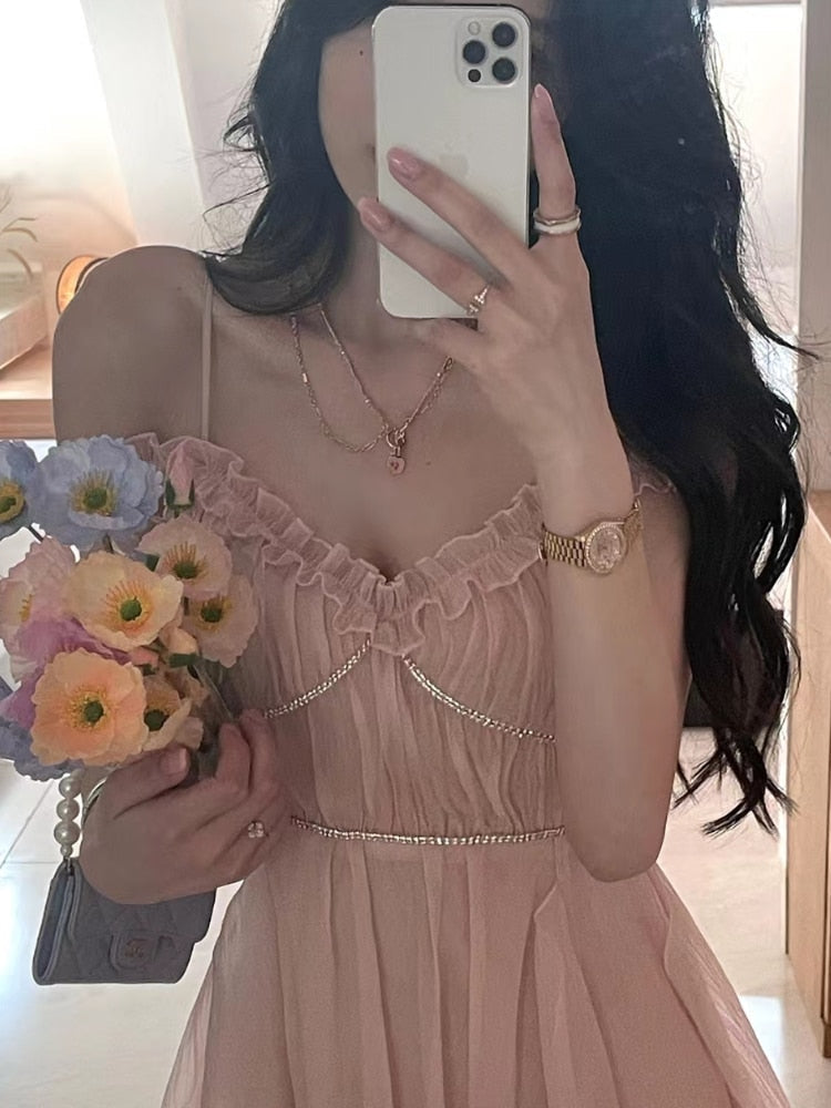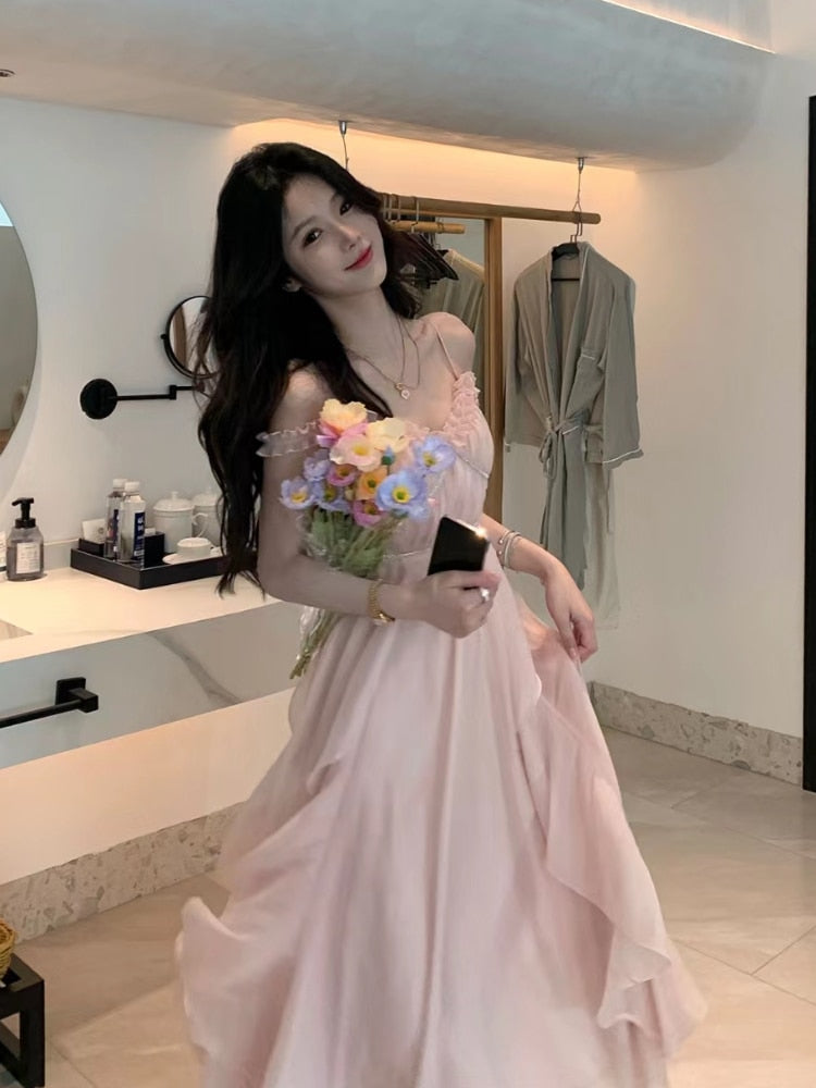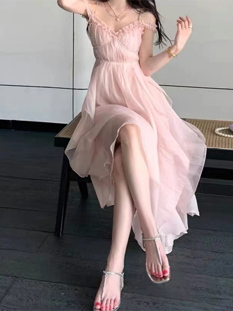 Harajuku French Korean Sweet V-Neck Camisole Sleeveless Sexy Strap Midi Maxi Dresses for Women Elegant Fairy Party Summer Pink