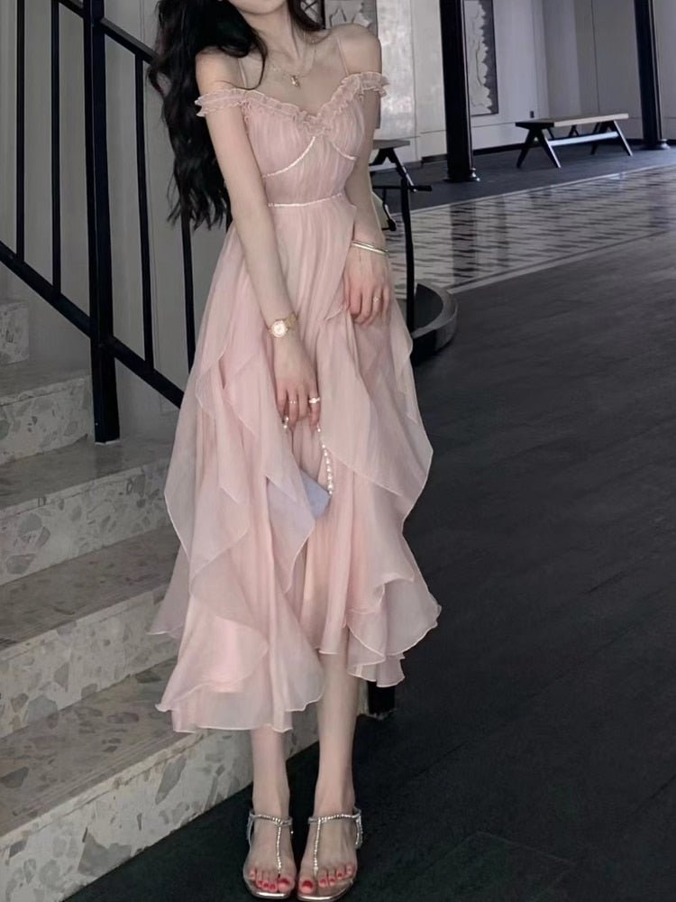 Hulianfu Harajuku French Korean Sweet V-Neck Camisole Sleeveless Sexy Strap Midi Maxi Dresses for Women Elegant Fairy Party Summer Pink