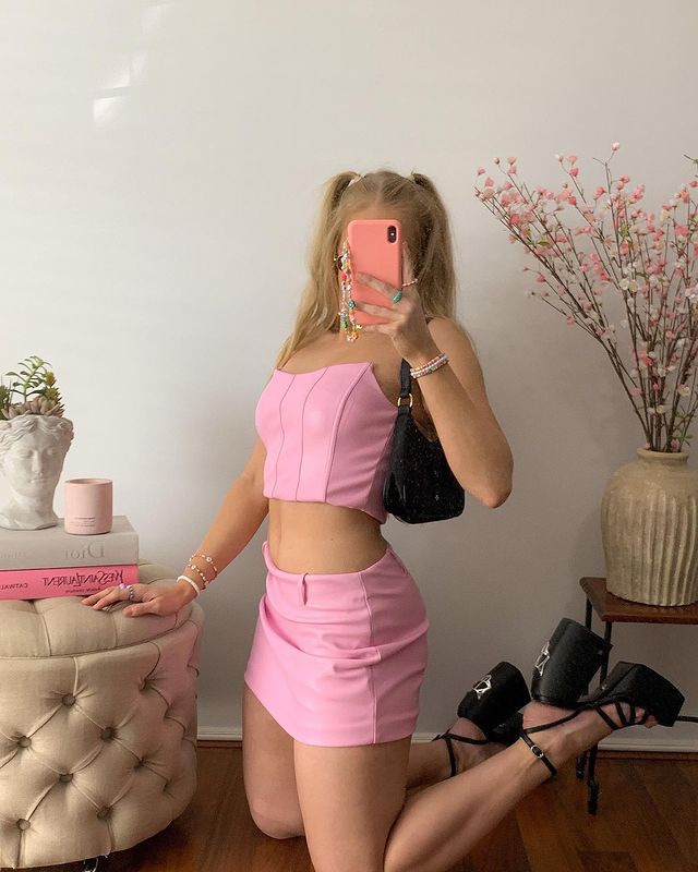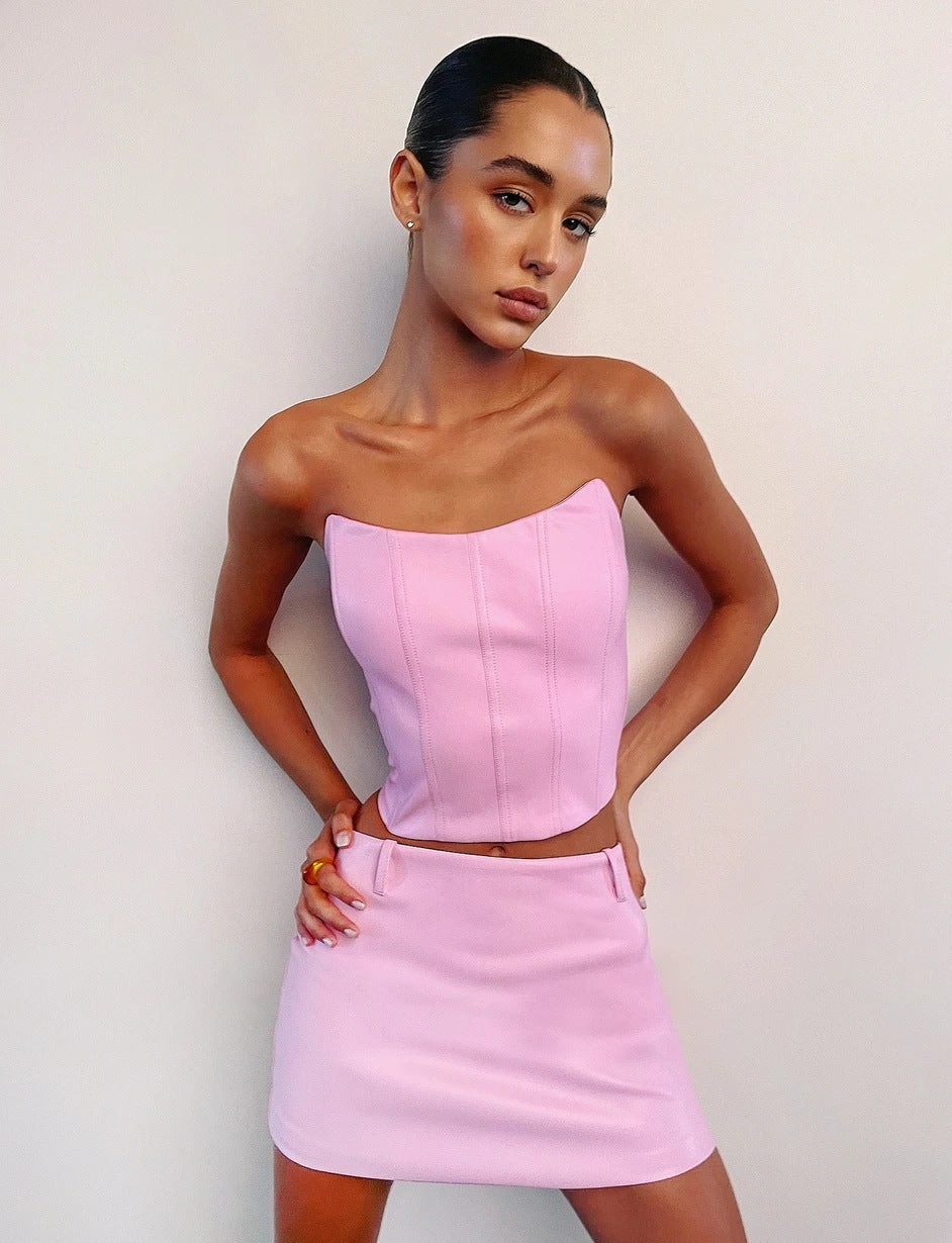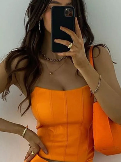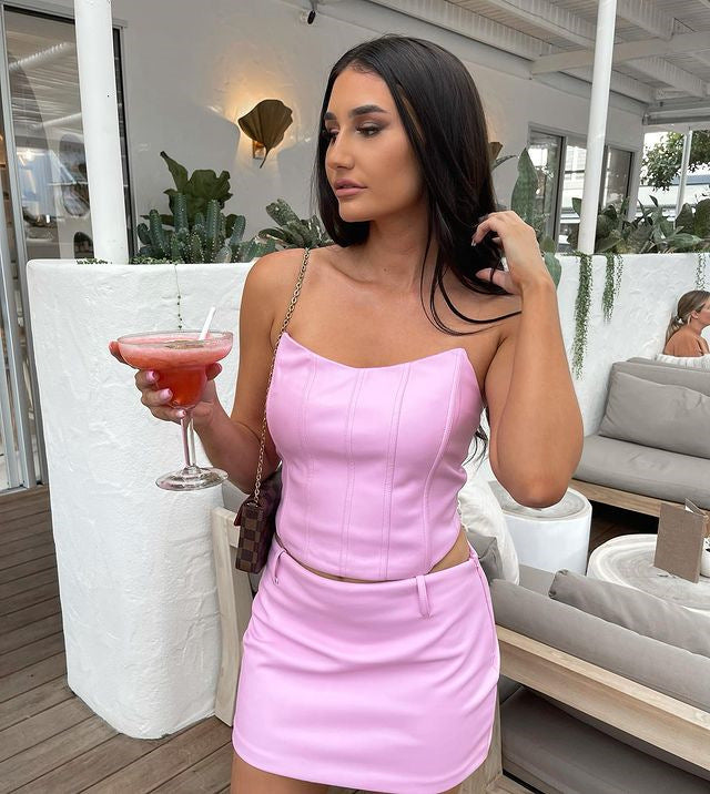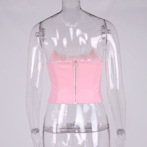 Hulianfu High Quality Summer Crop Top Women Fishbone Double Layer Pink PU Leather Sexy Crop Top Fashion Lady Clubwear Party