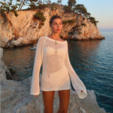 HULIANFU 2025 women's clothing New autumn new seaside vacation sexy simple knitted see-through blouse dress women