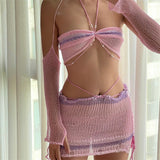 HULIANFU New summer new 2025 style contrasting color pearl neck sleeve chest wrapping knitted sexy hip skirt knitted suit women