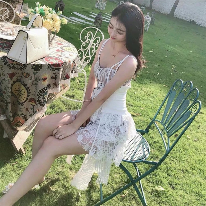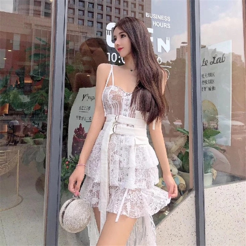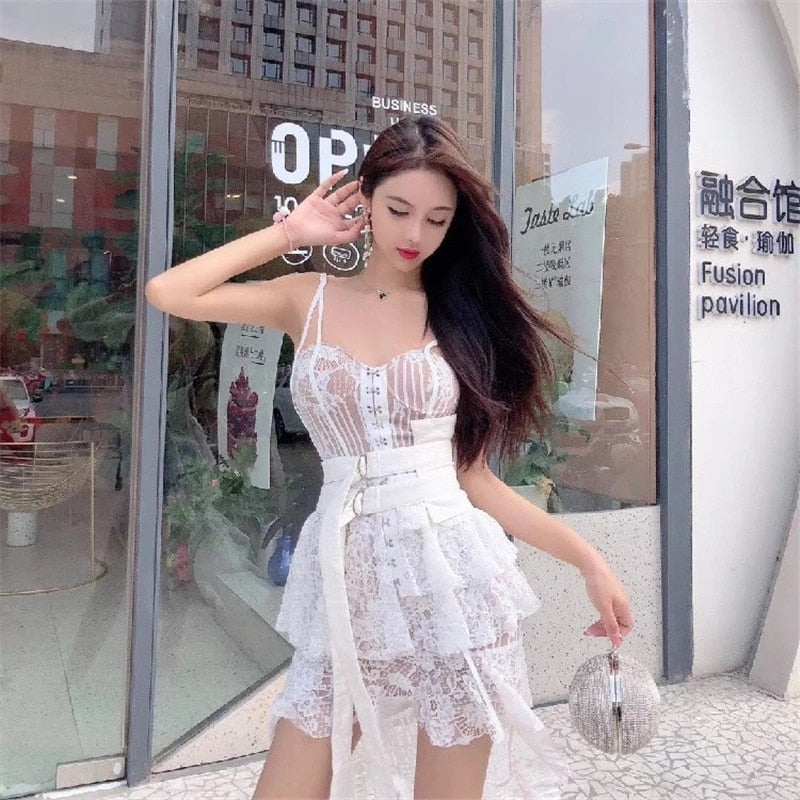 hulianfu New Women Summer Lace Dress Female Spaghetti Strap Irregular See Through Mini Dress Lady Club White Patchwork Runway Sexy Dress