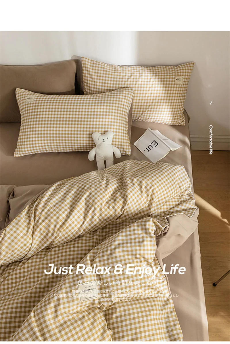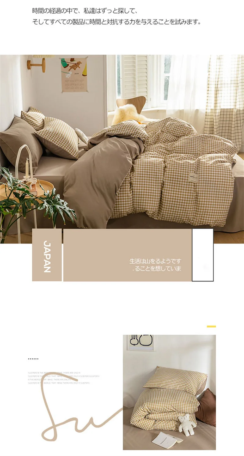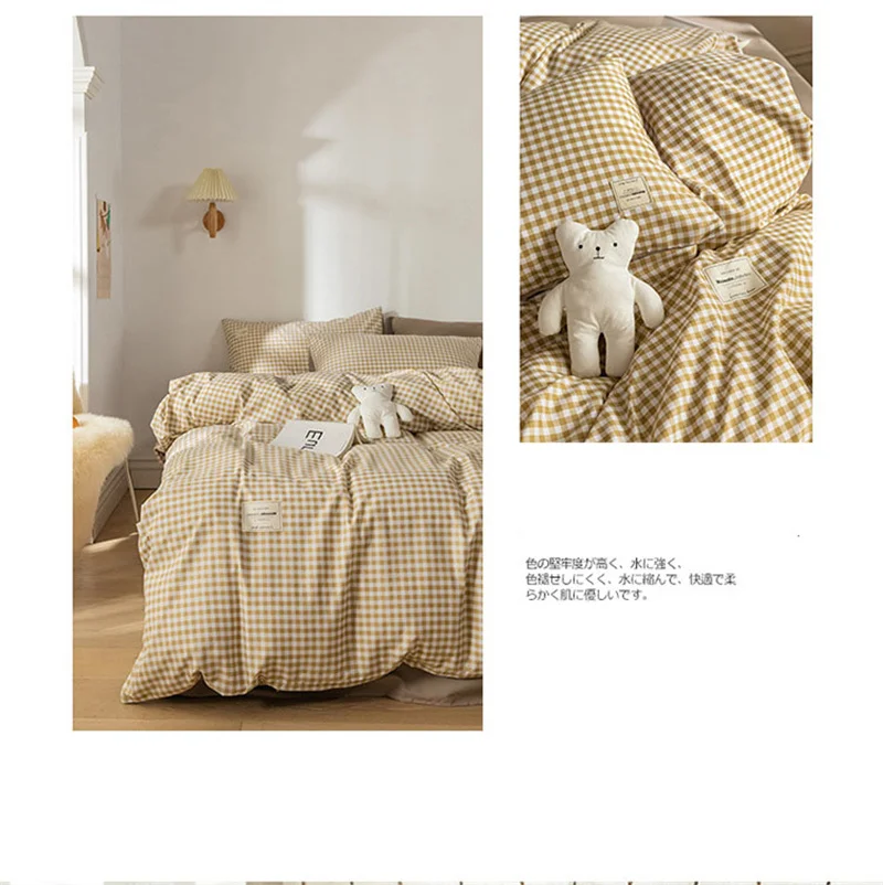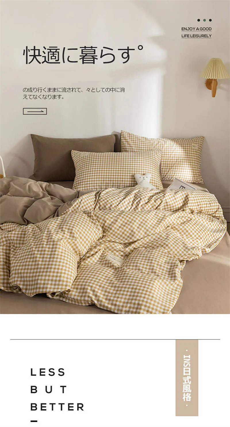 HULIANFU Japan Style Plaid Pattern Bedding Set Queen Simple Washed Cotton Bedding Duvet Cover Set with Sheets Quilt Cover Pillow Covers