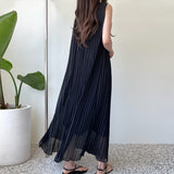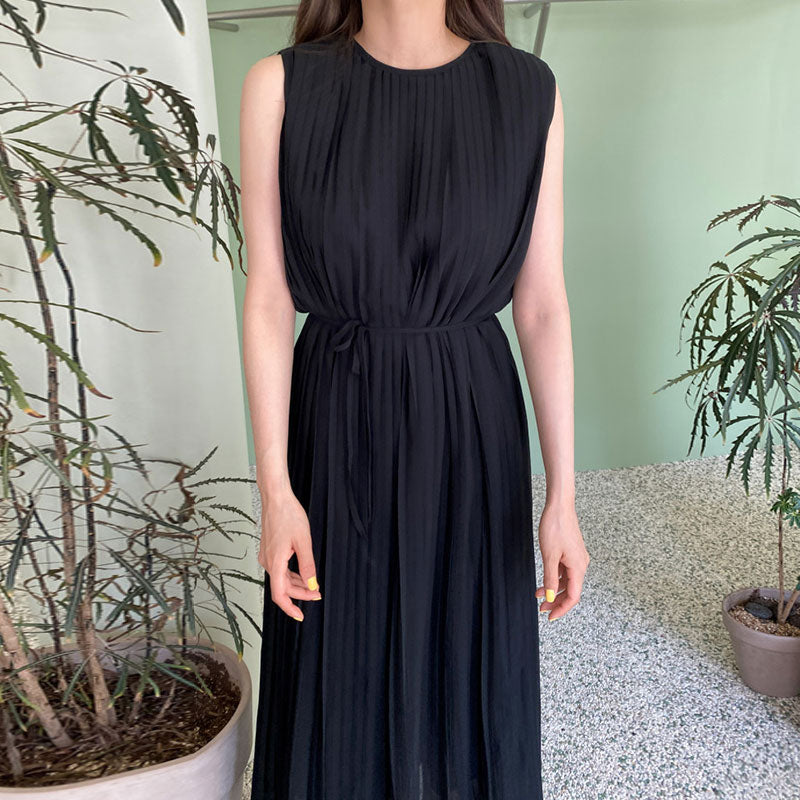 Korea's Chic Summer Retro Round Neck Lace-up Waist Slim Sleeveless Long Pleated Dress