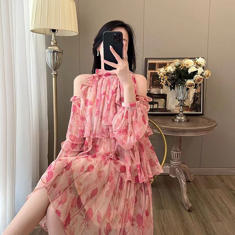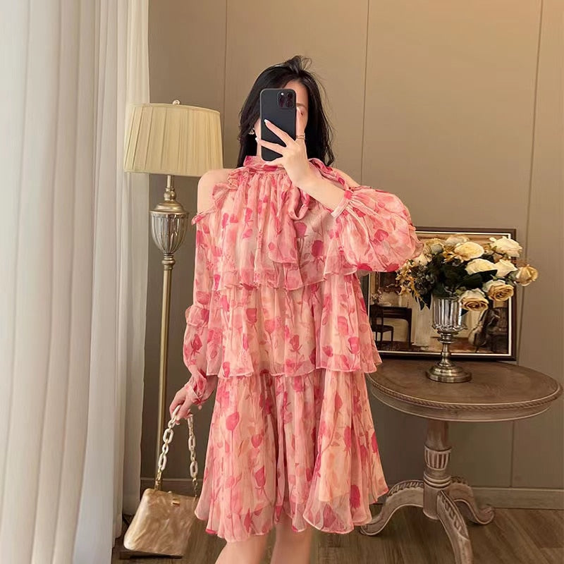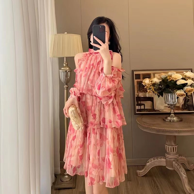 Lantern Sleeve Summer Dress New French Style Floral Dress for Women 2023 Sweet Elegant Tierred Knee Length Mini Dress
