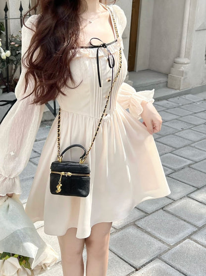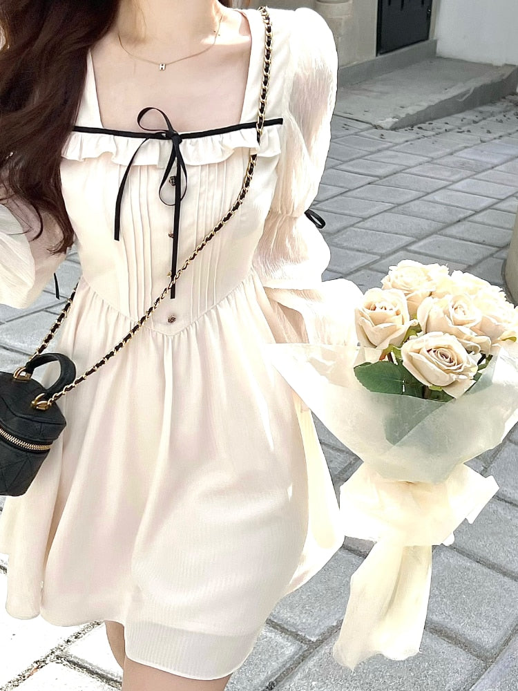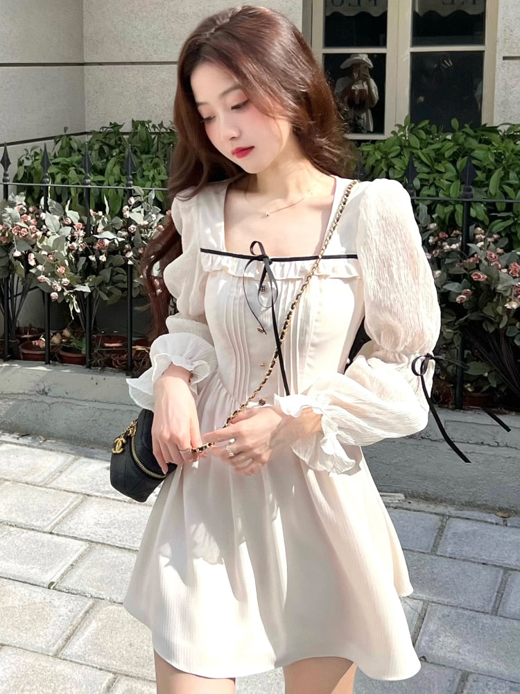 Hulianfu Lolita Bandage Mini Dress for Women Party Y2k Casual Long Flare Sleeve Vintage One Piece Dress Elegant Korea Fashion Autumn
