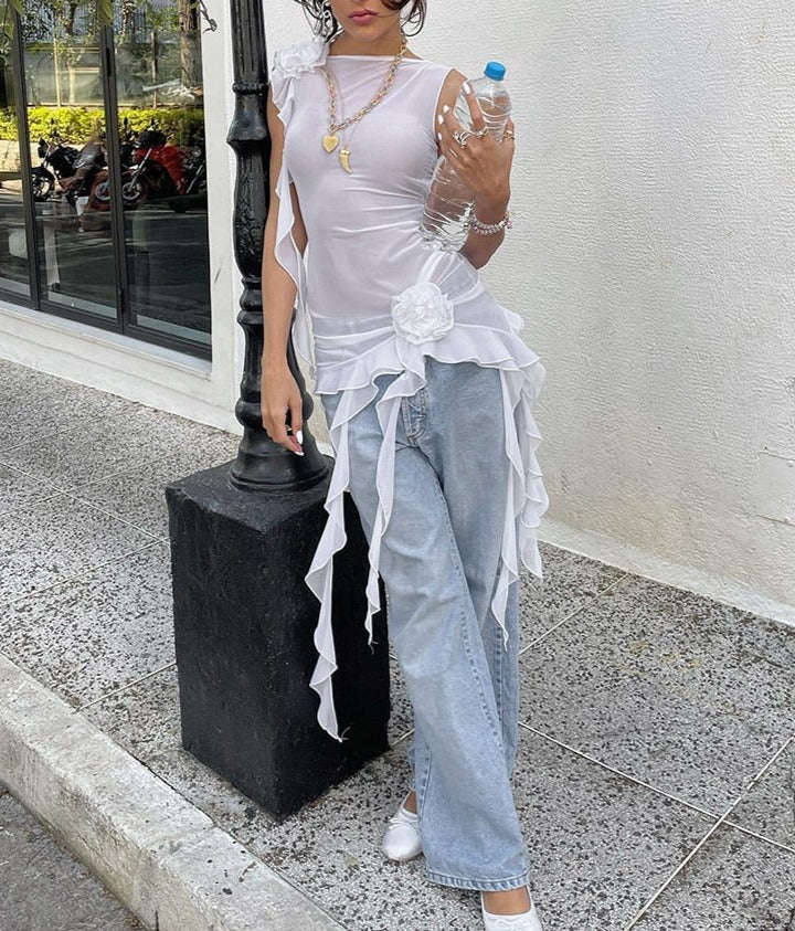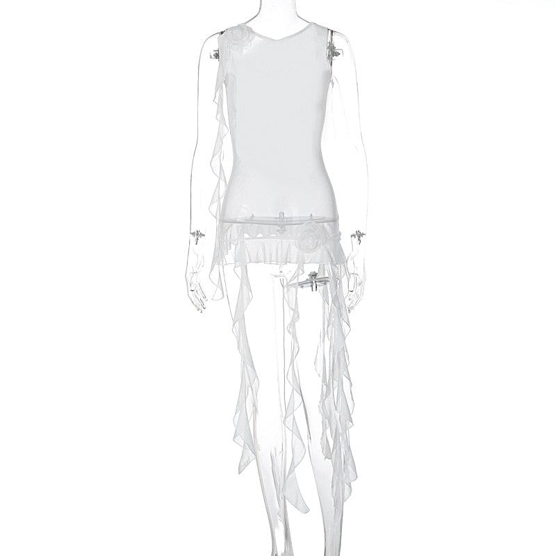 Hulianfu Mesh Sleeveless Backless Solid Tassel See Through Sexy Slim Top T Shirt Autumn Women Kawaii Party Club Halloween