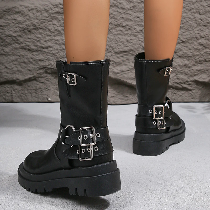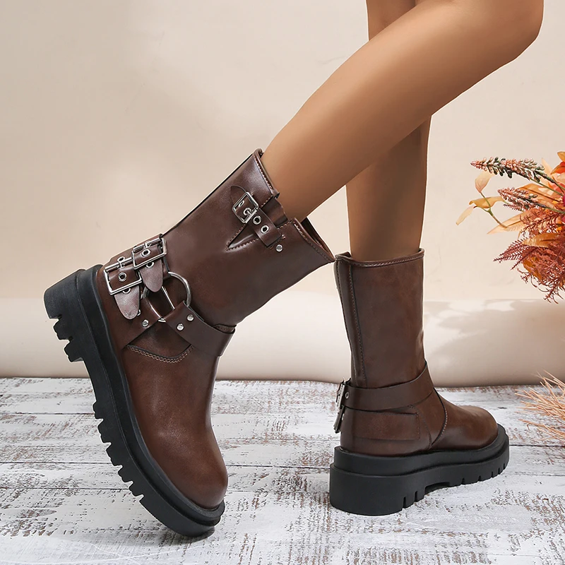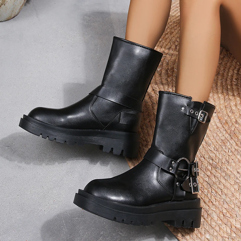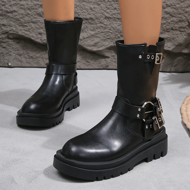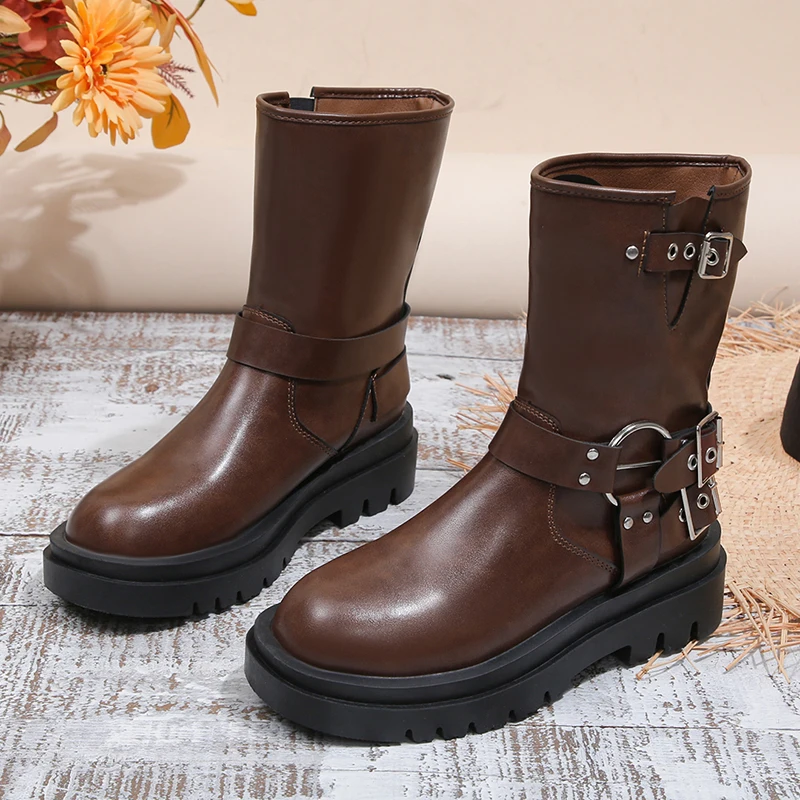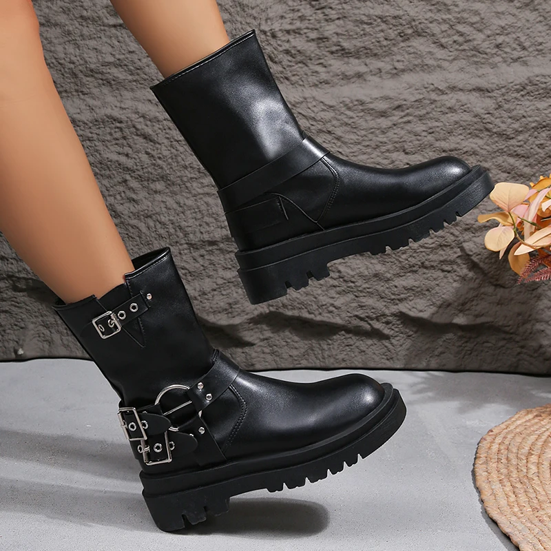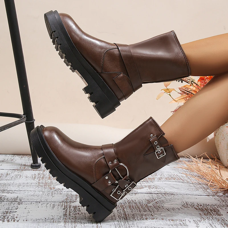 Metal Decor Platform Ankle Boots Women Autumn Black Thick Bottom Short Botas Woman Plus Size 43 Pu Leather Motorcycle Shoes