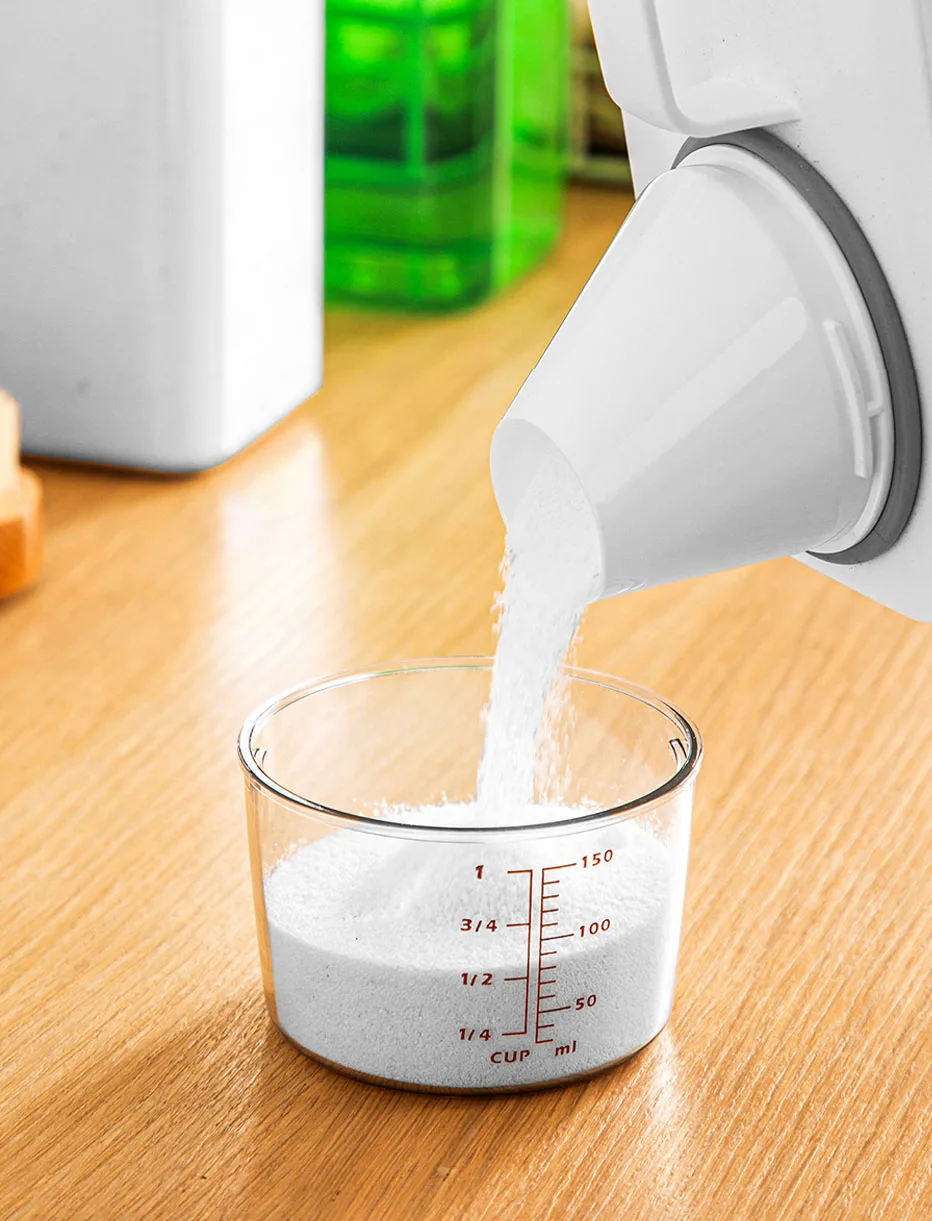 The container have a measuring cup and pour spout, which provides a merry pouring feeling and makes every pouring neat and clean;