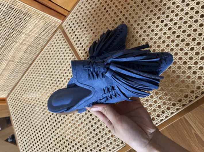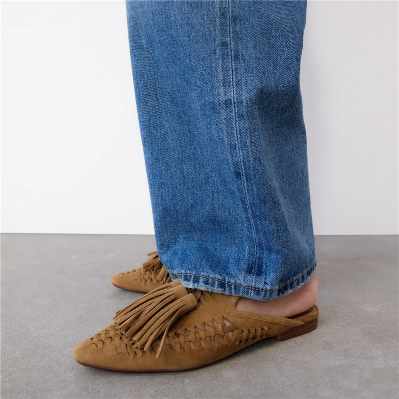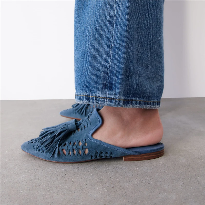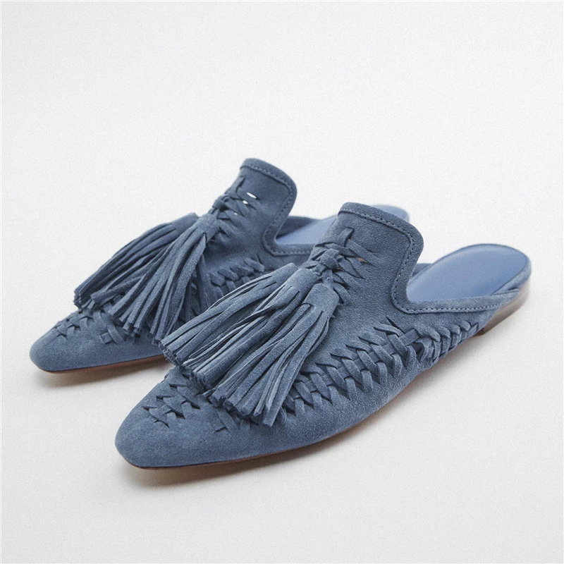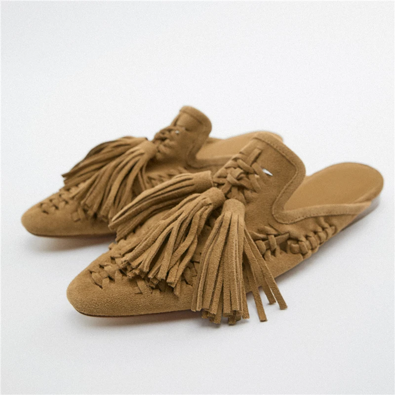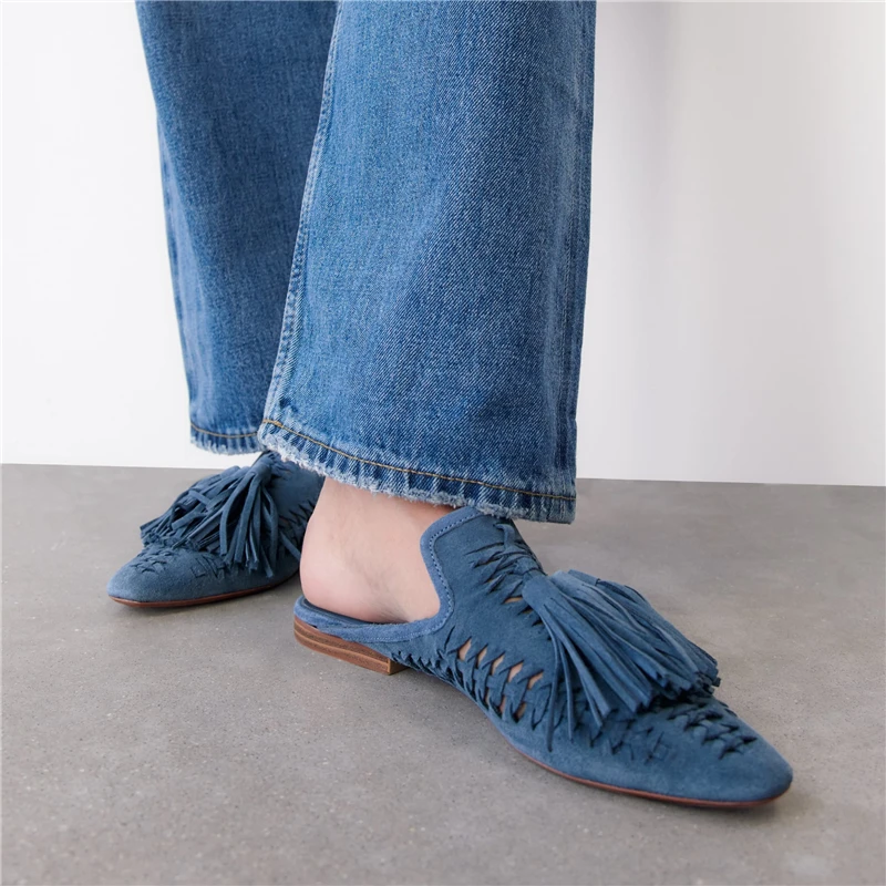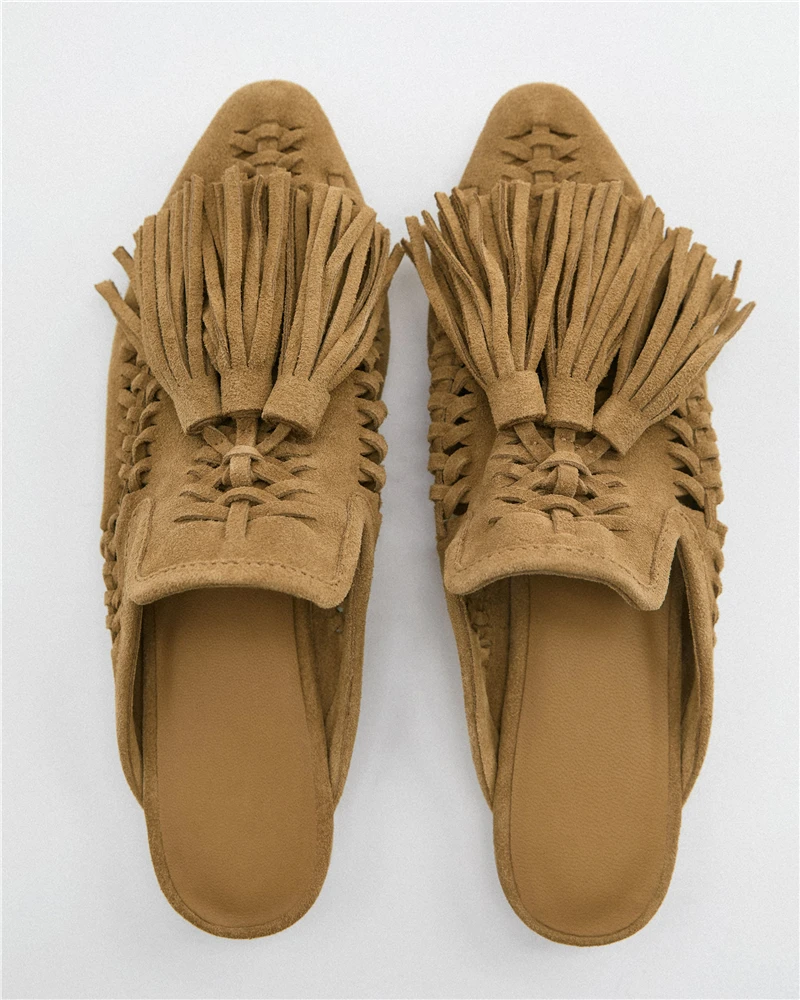 New Genuine Suede leather Oxfords Women Fringe Tassel Slides Mules Streetwear Flat Heel Cut Out Shoes Slippers Plus Size