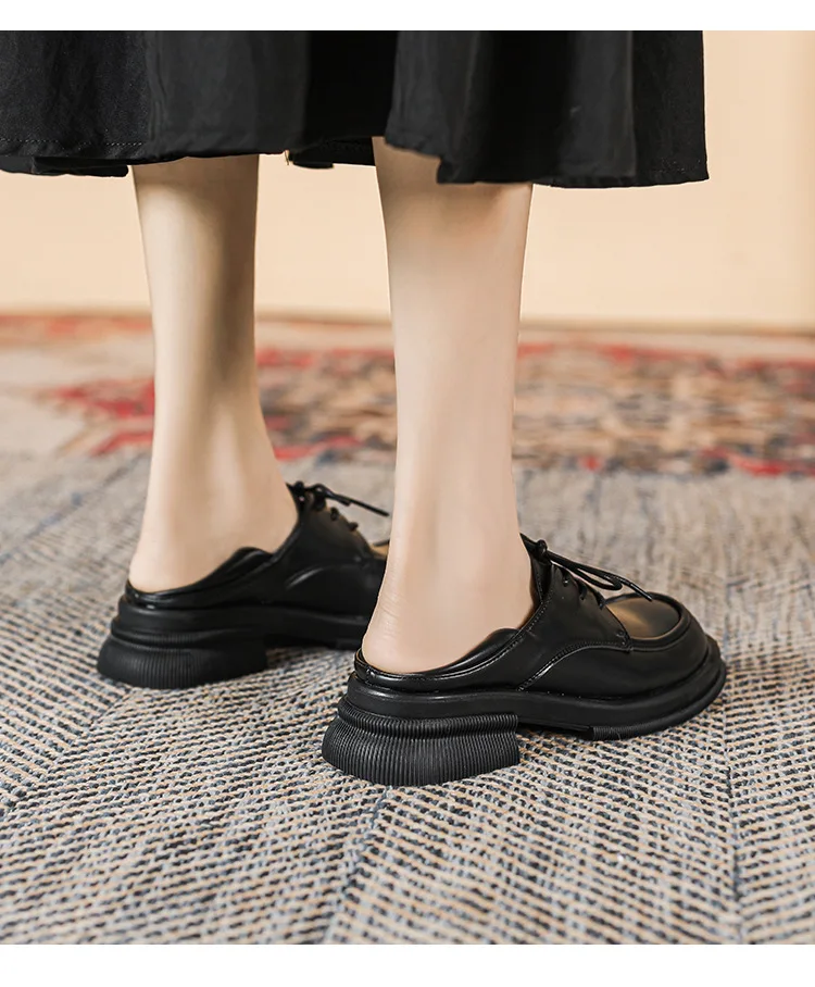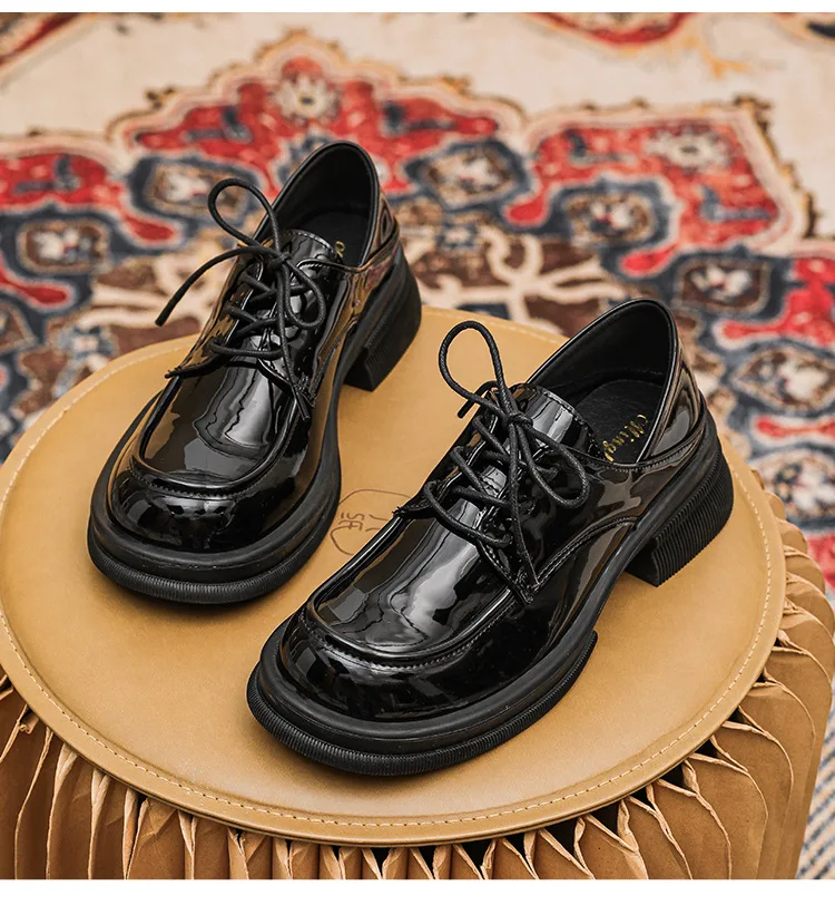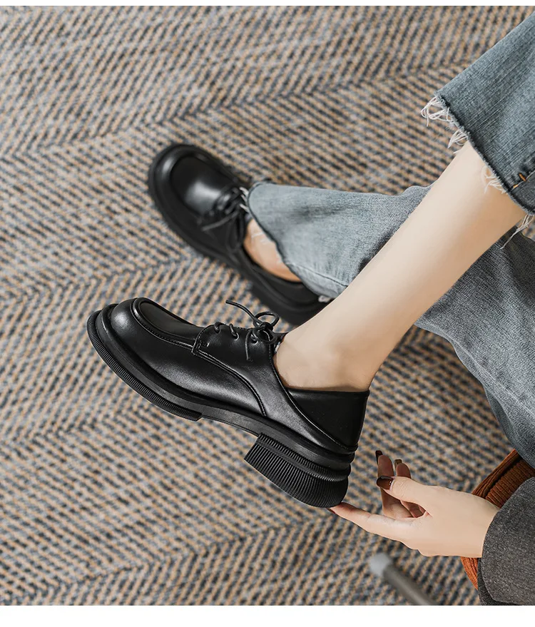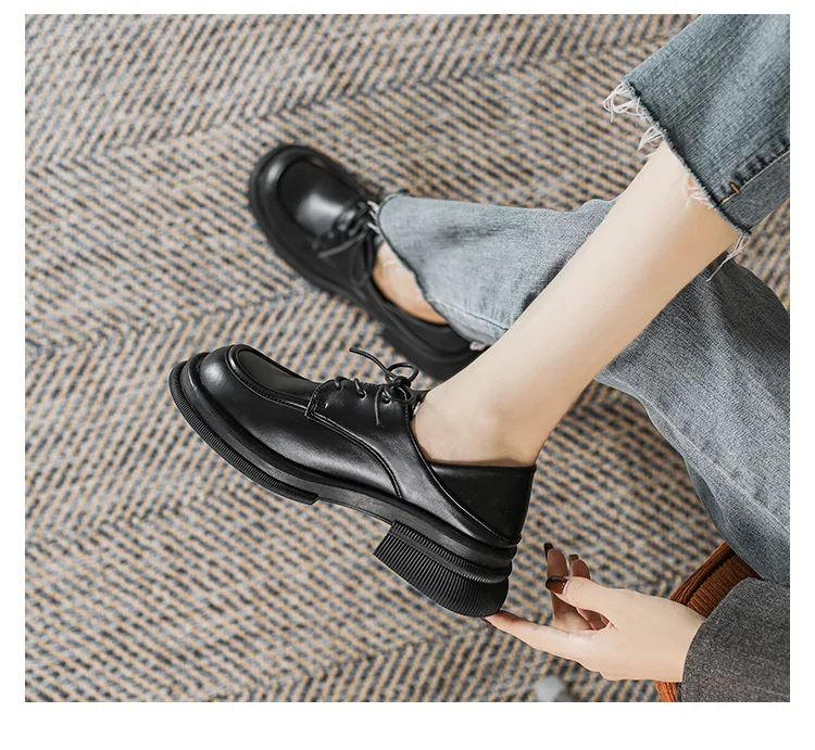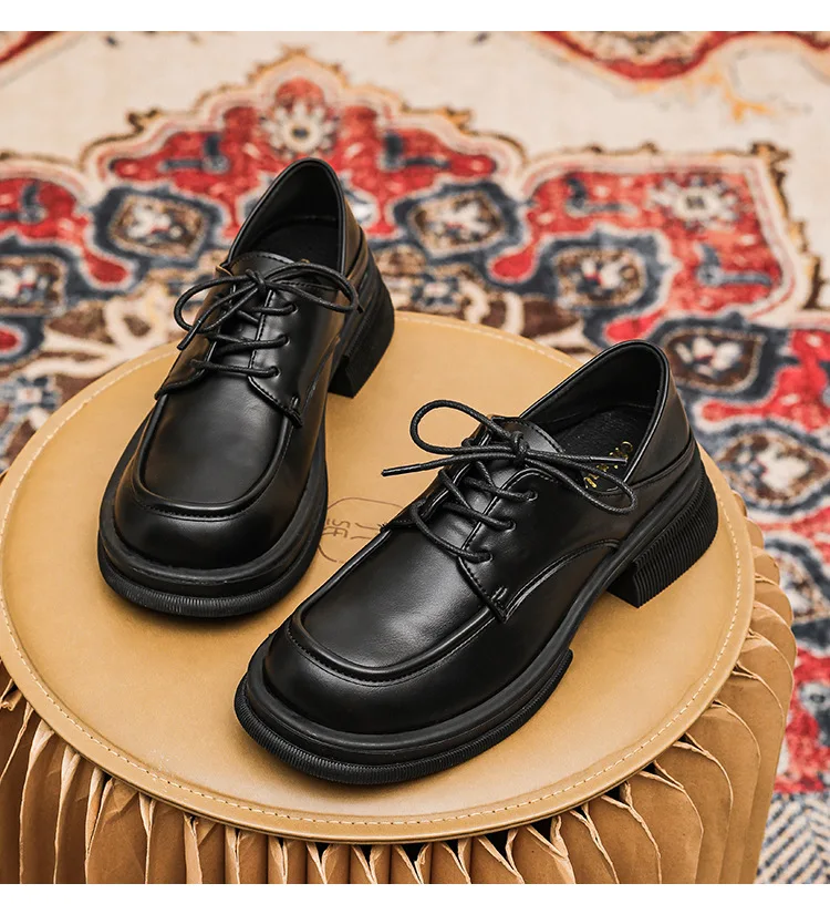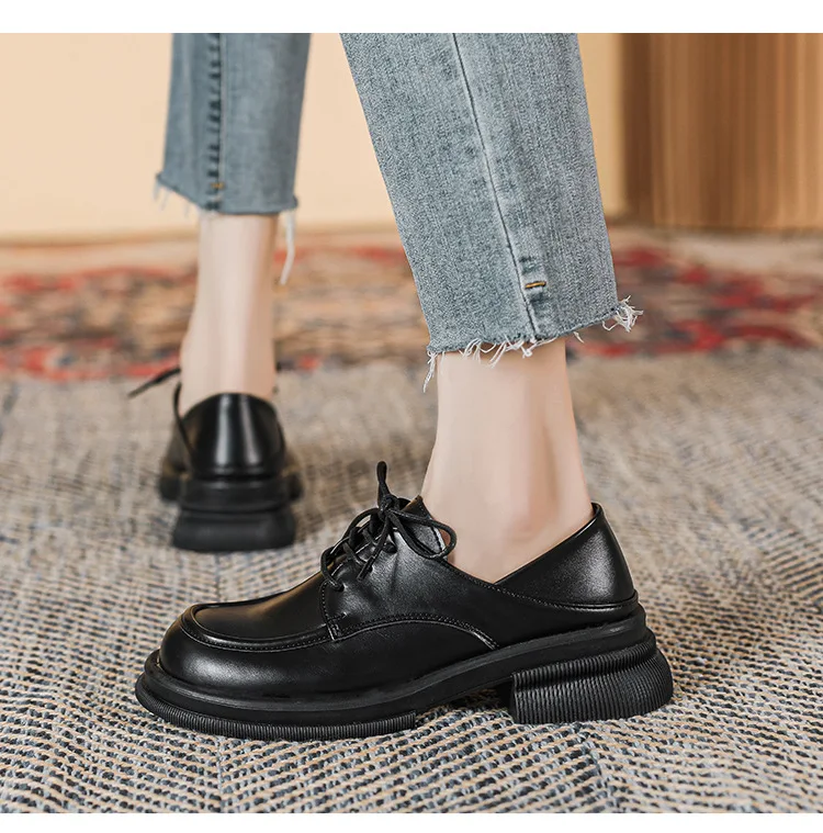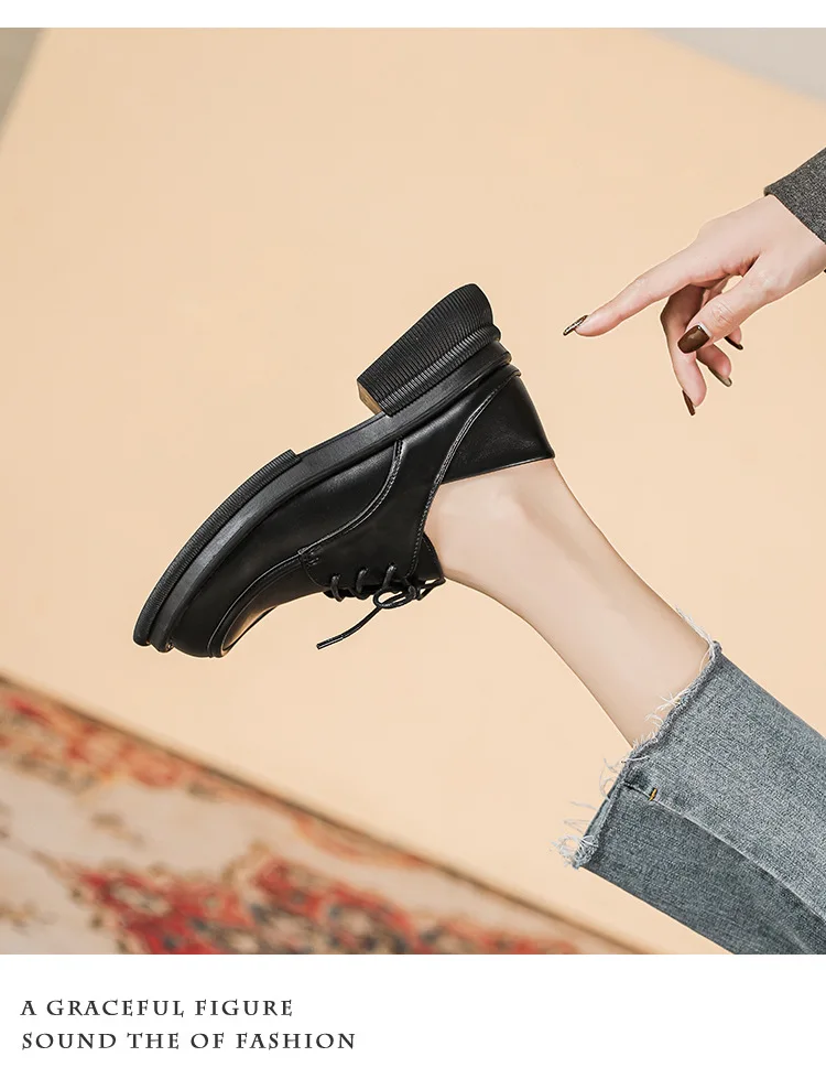 New women's loafers Black lace-up shoes Round head high heel thick base high design Leather shoes Stylish party and work