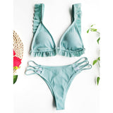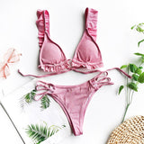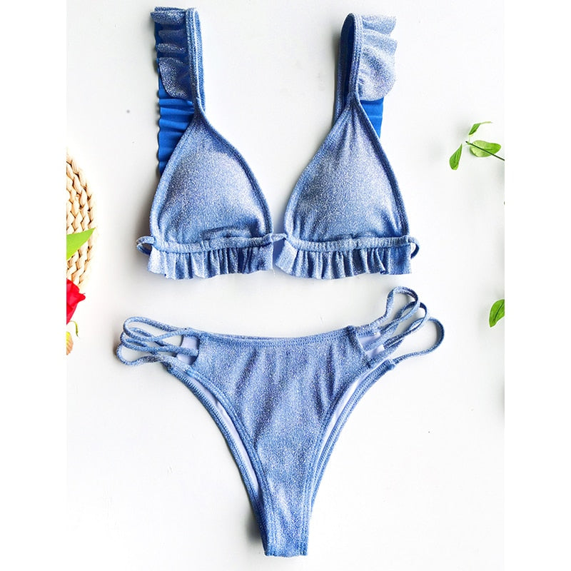 Peachtan Shiny ruffle bikini Micro solid swimsuit women Hollow out backless swimwear female Frill String bathing suit New