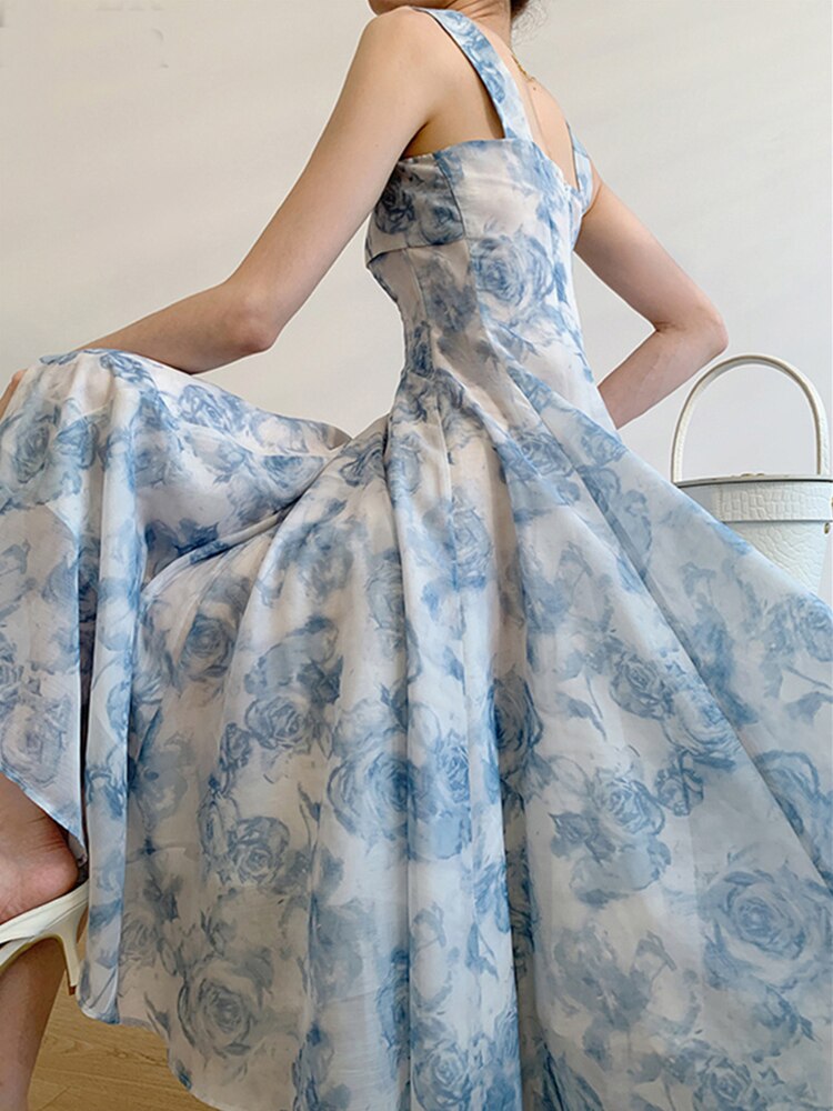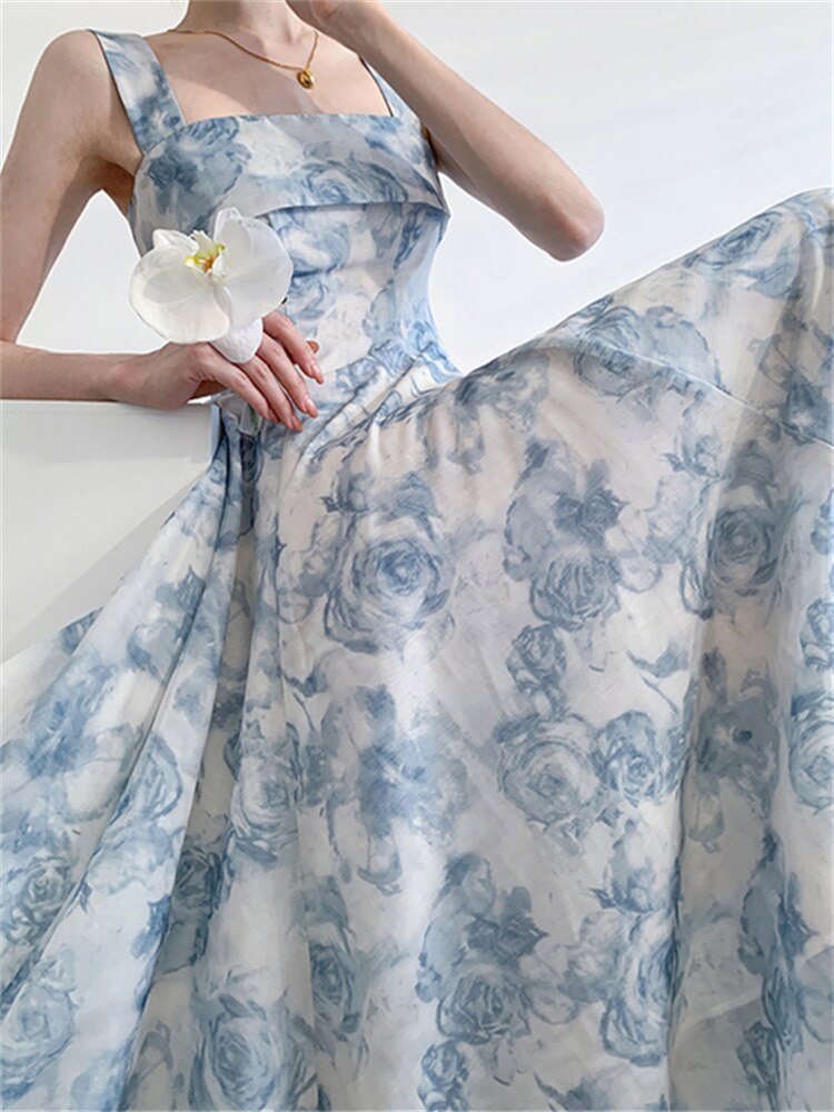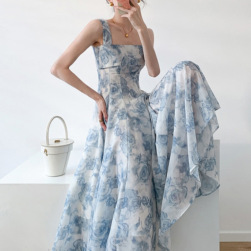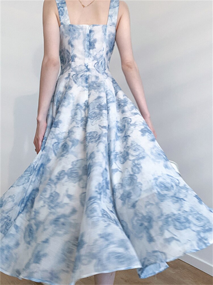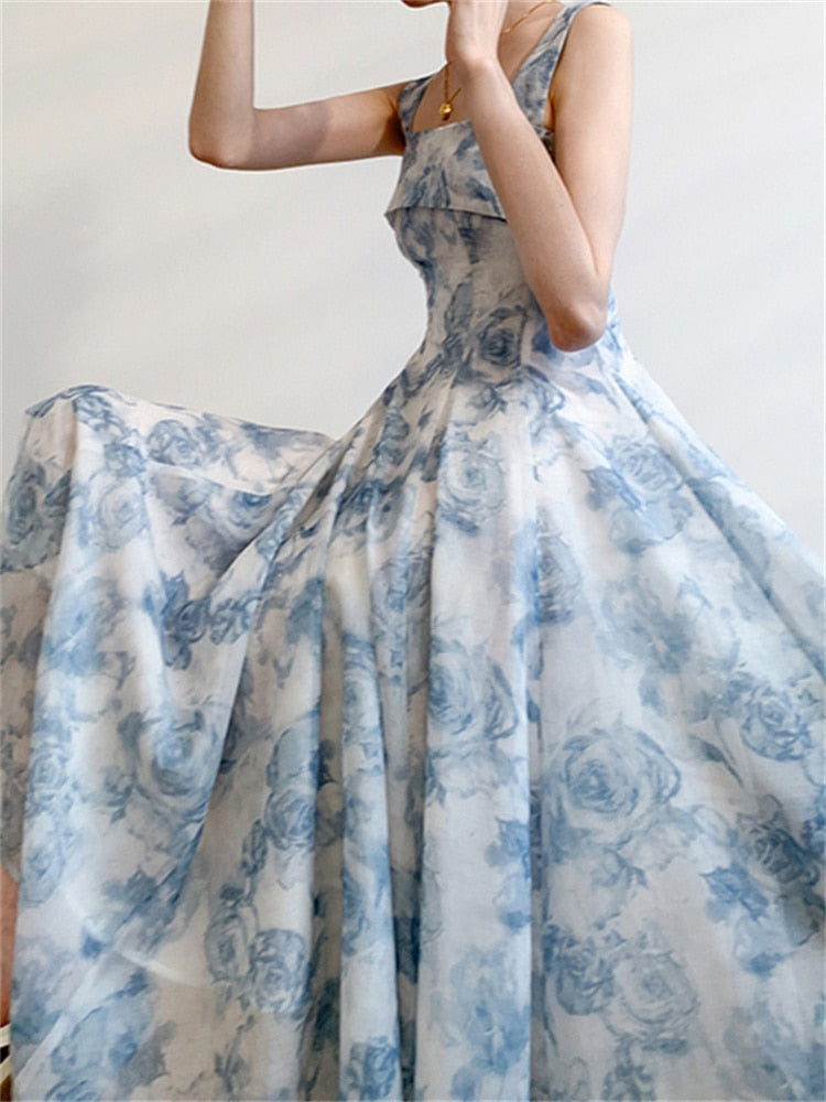 Hulianfu Print Dress for Women 2023 Fashion Fairycore Spaghetti Strap Summer Dress Chic Elegant Square Collar Slim Midi Dress