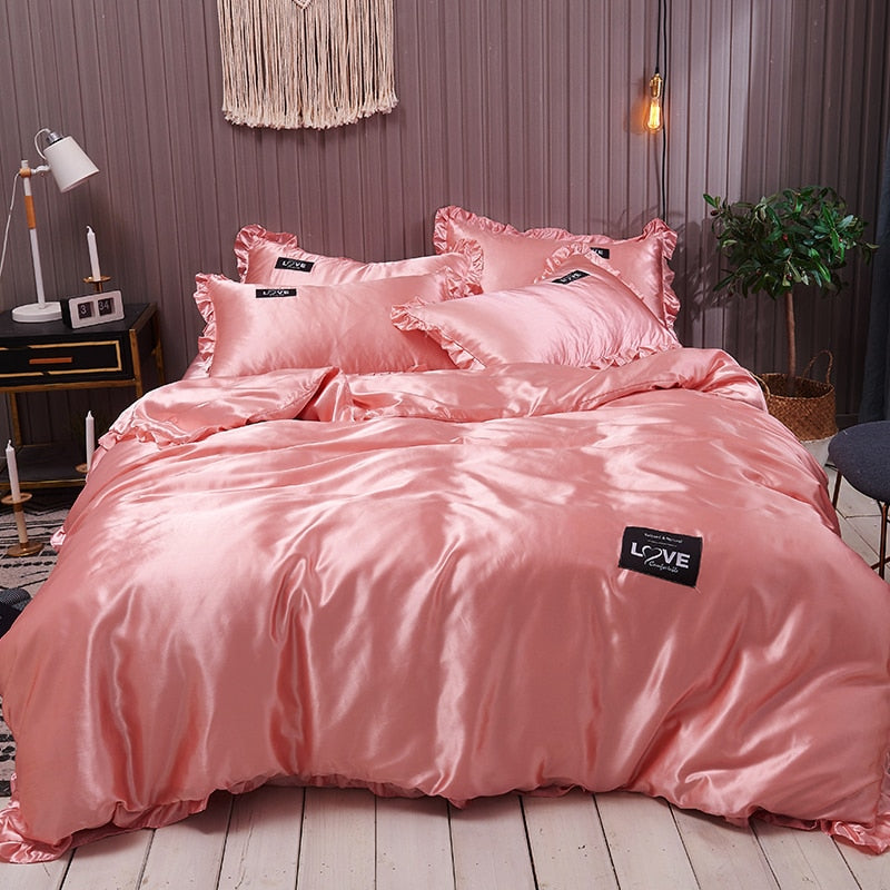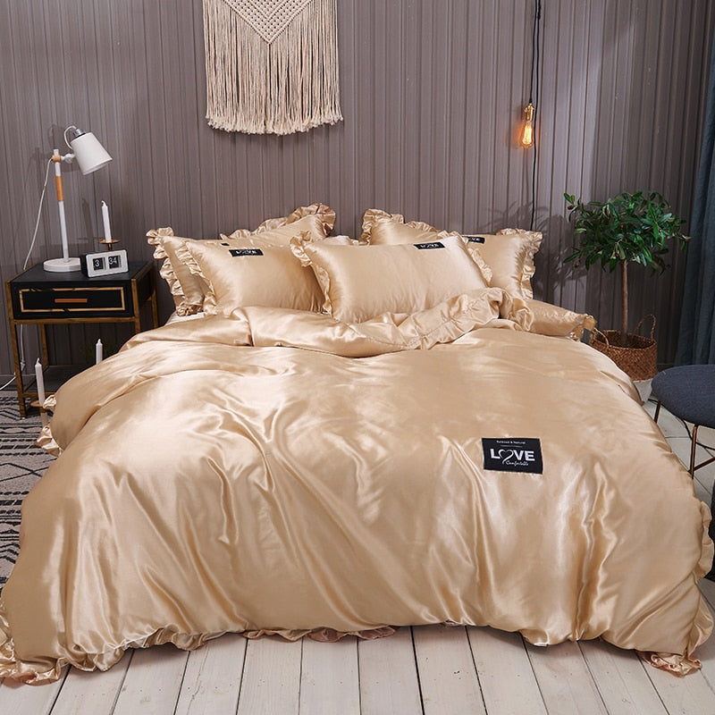 HULIANFU Pure Satin Silk Bedding Set Lace Luxury Duvet Cover Set Single Double Queen King Size 240x220 Couple Quilt Covers White Gray Red