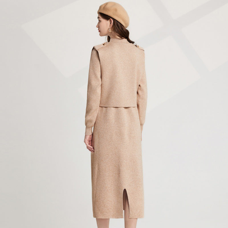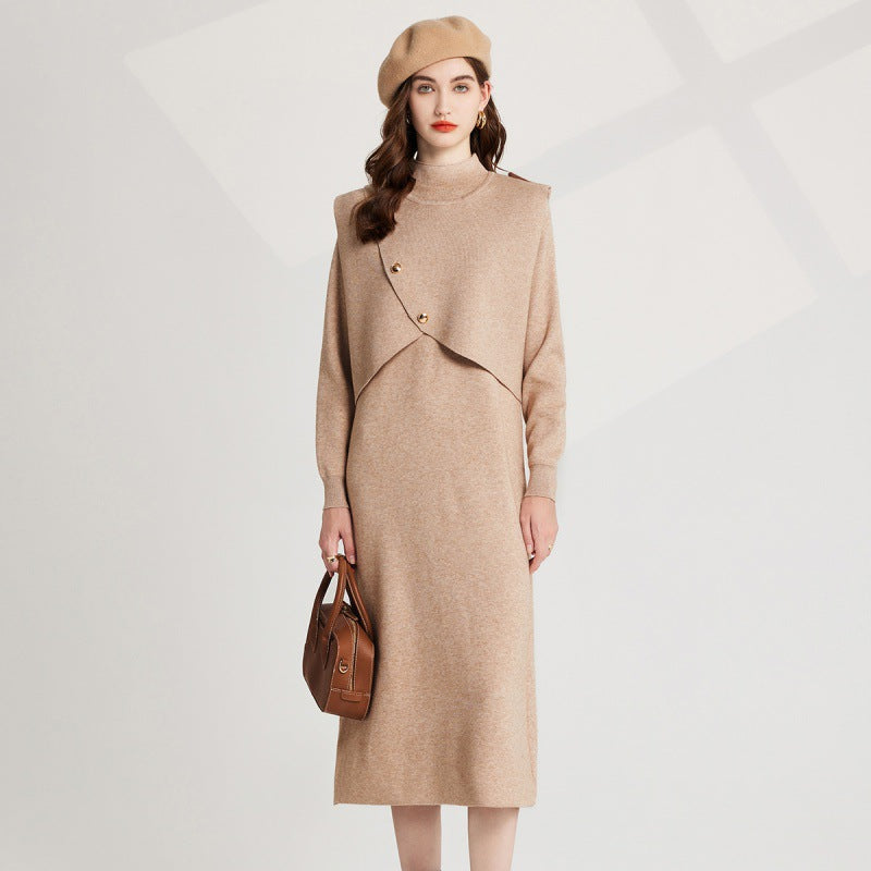 Real shot, fashionable thickened personalized semi-turtleneck bottomed knitted vest + long-sleeved dress, two-piece set