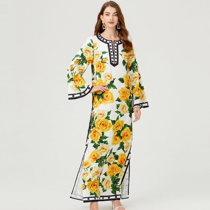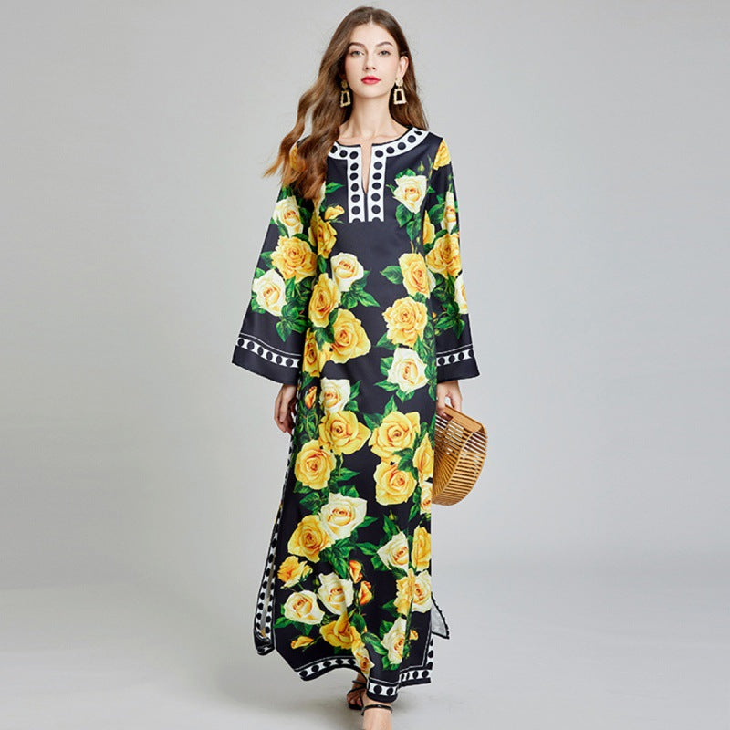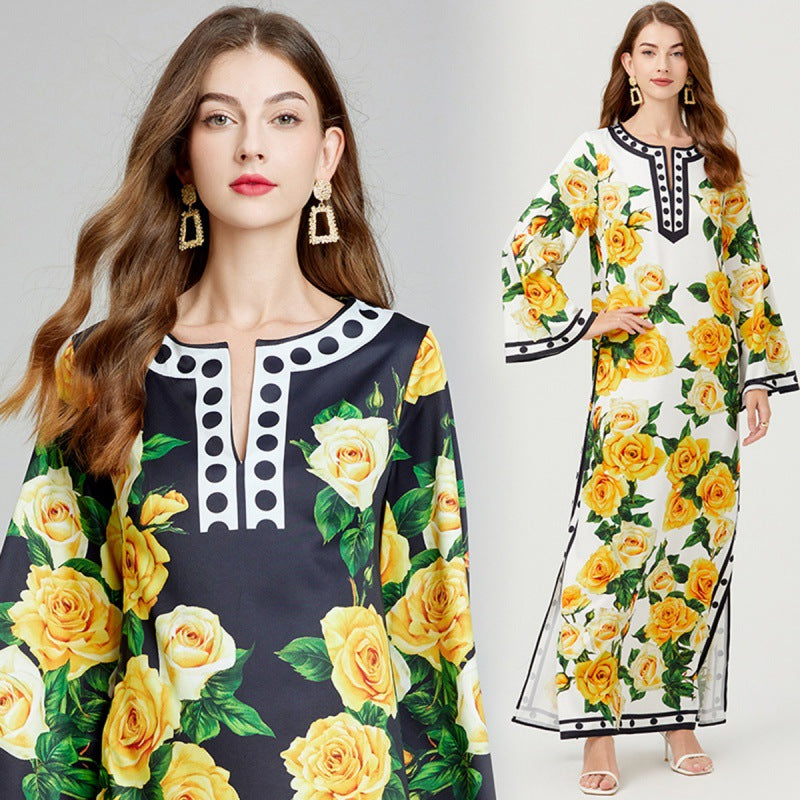 Real shot, retro printing polka dot round neck split-neck long-sleeved personalized dress, loose dress is fashionable and elegant
