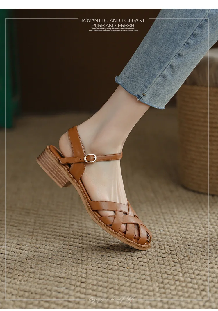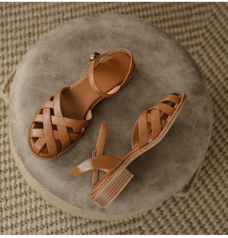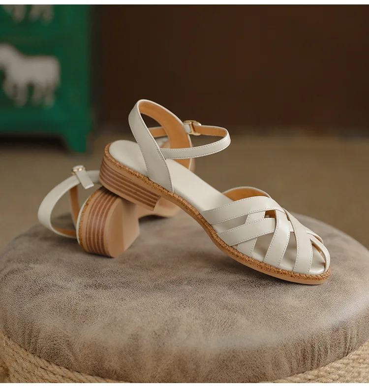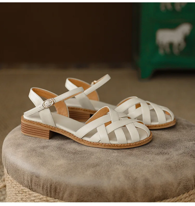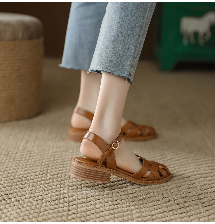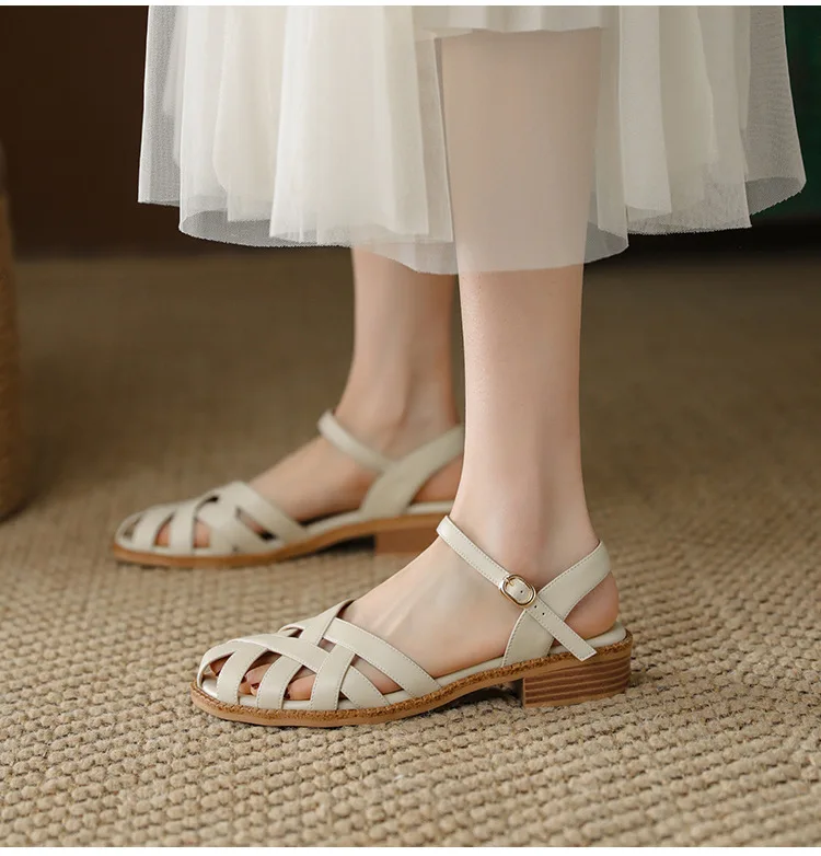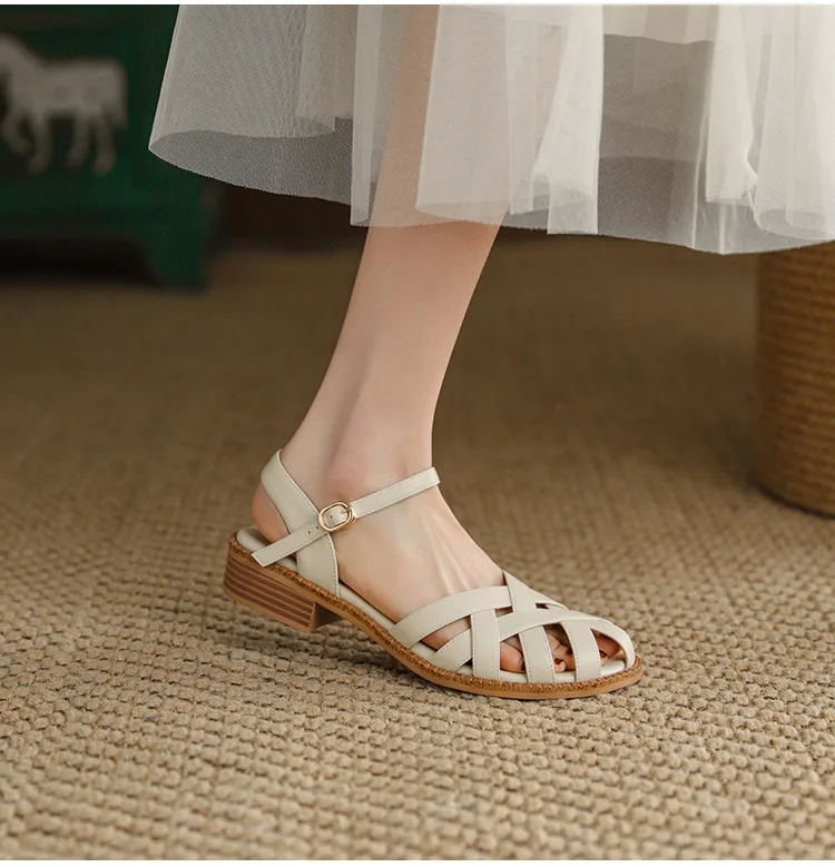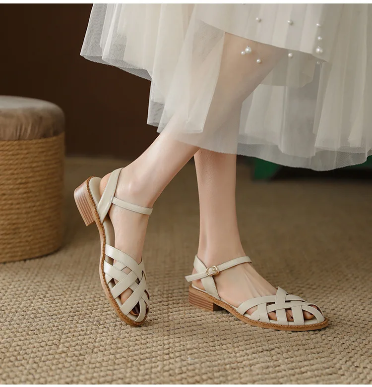2024 Sandals Retro Woman Shoes Block Heels Suit Female Beige Breathable New Original Chunky Summer Black Girls Low Closed Gladia