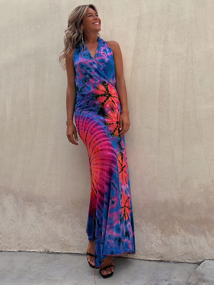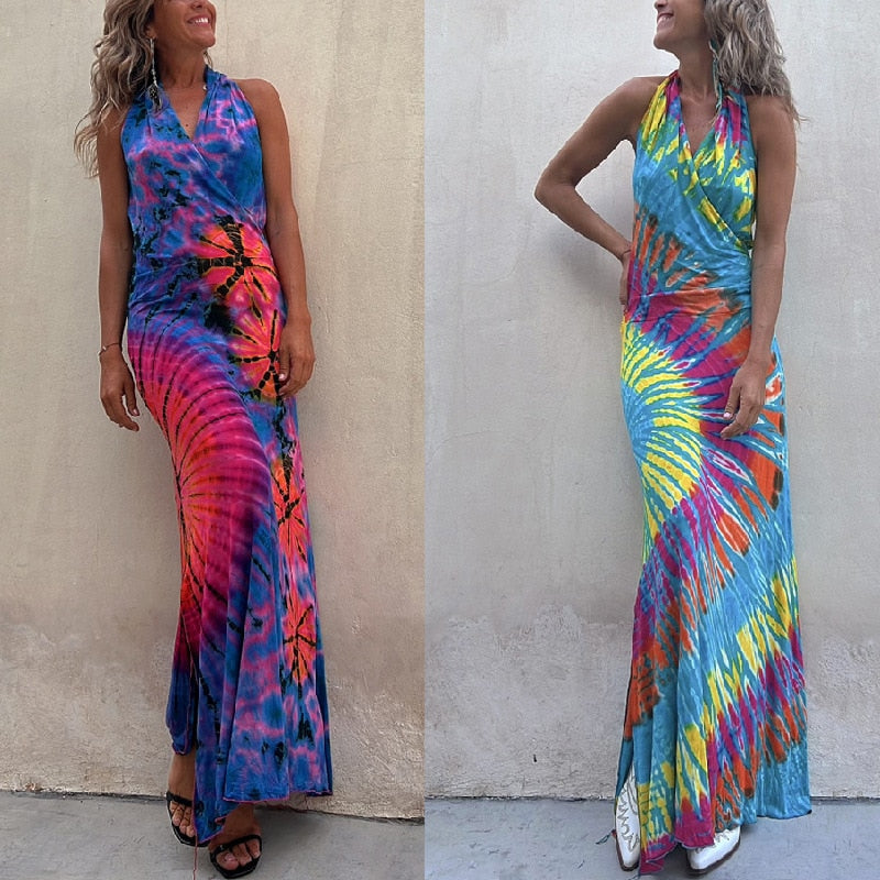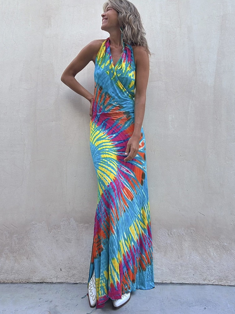 Hulianfu Sexy Backless Halter Print Long Bodycon Dress Women 2023 Summer Boho Holiday V-neck Sleevless Bodycon Dresses For Women Sundress