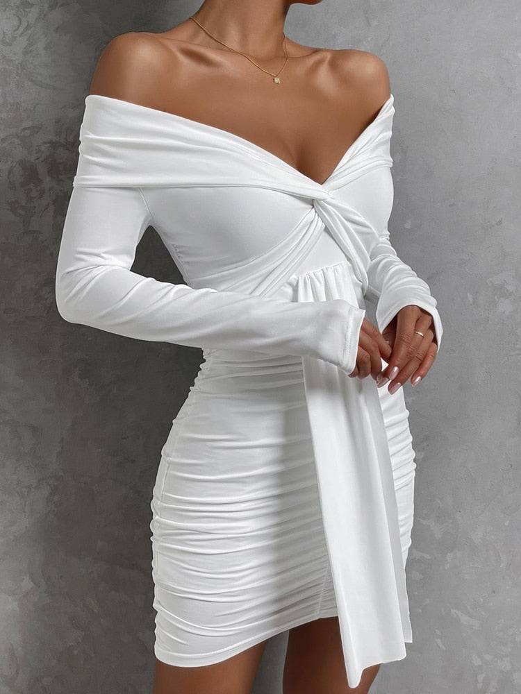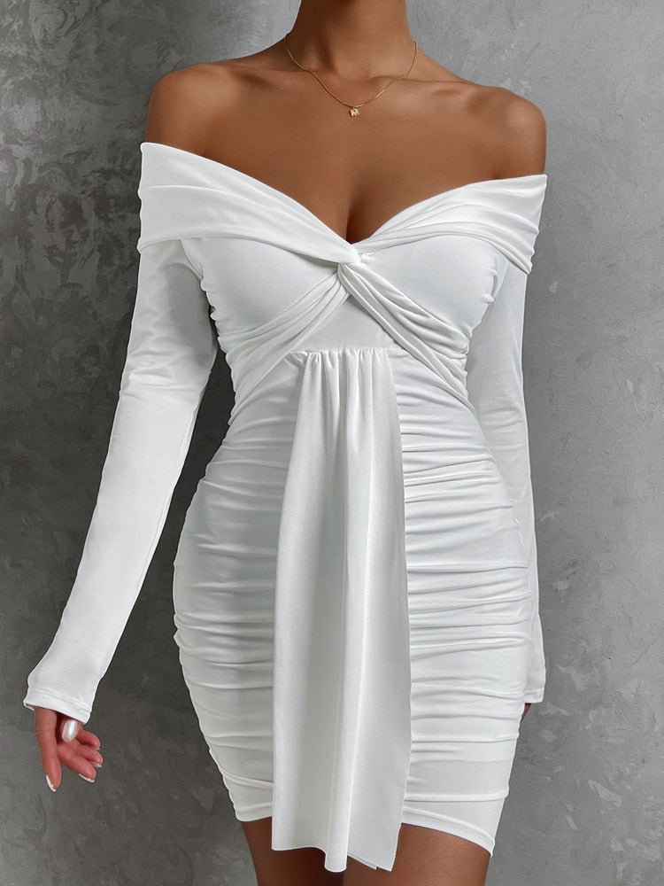 Hulianfu Sexy Tight Long Sleeve Short Club Dress White Evening Bodycon Dresses For Women Off Shoulder Party Mini Dress