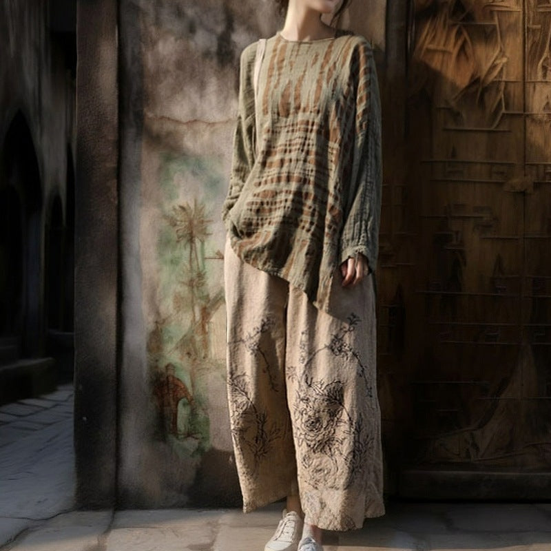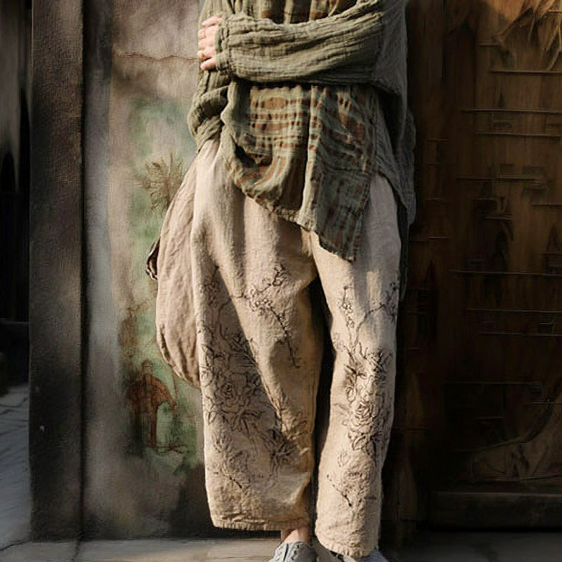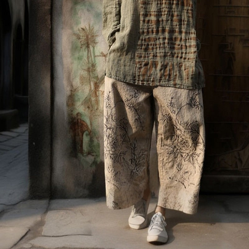 Shan Qian Nianyi, enjoy life slowly, hand-rubbed cotton and linen casual pants, literary and retro old printed wide-leg pants