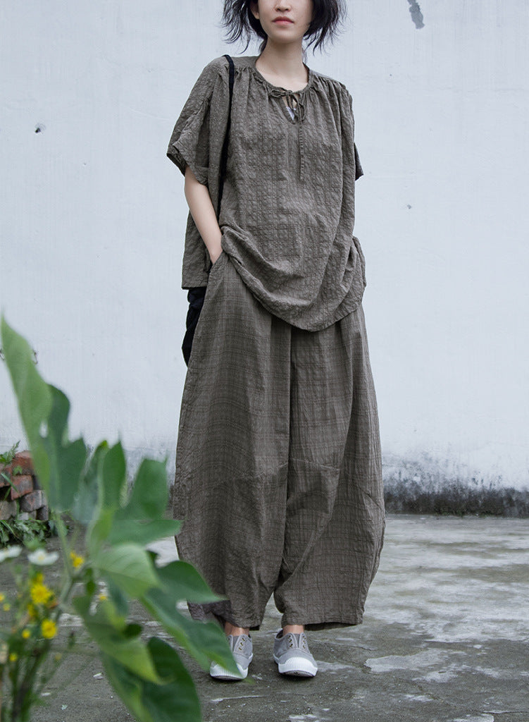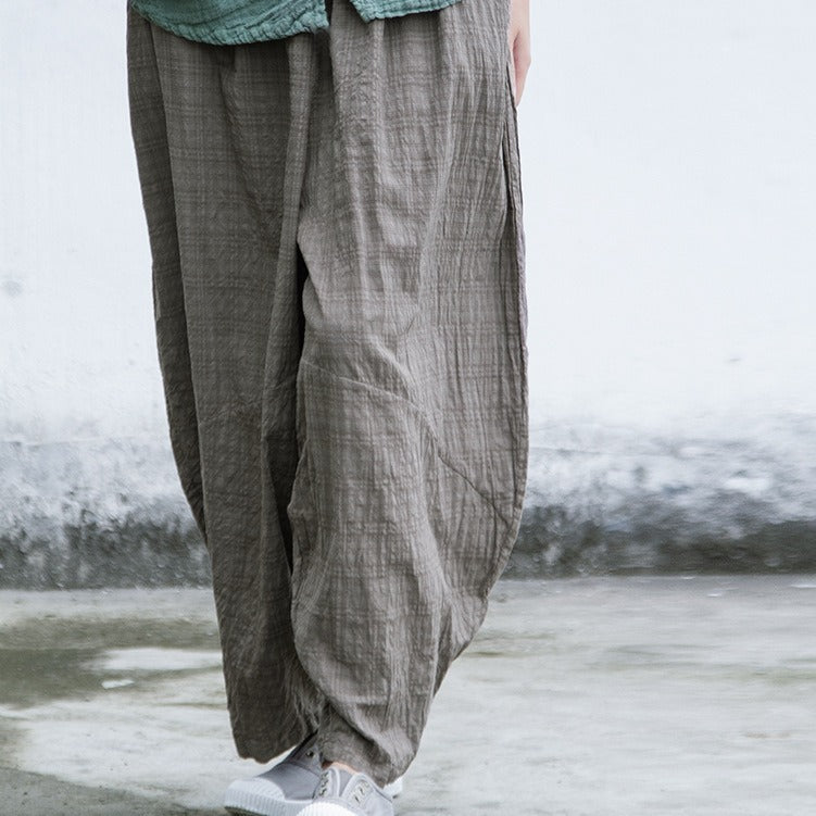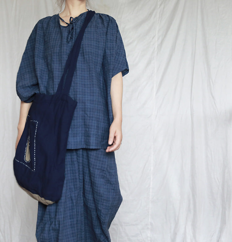 Shan Qian Nianyi, neutral literary and artistic spring and summer cotton and linen soft and comfortable blue plaid casual wide-leg pants