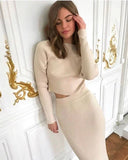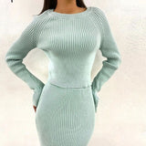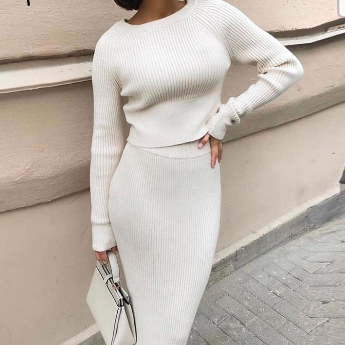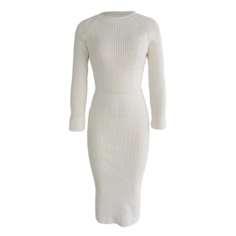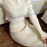 Elegant stripe two piece dress White round neck knit dress High waist street style Autumn winter dress two piece set