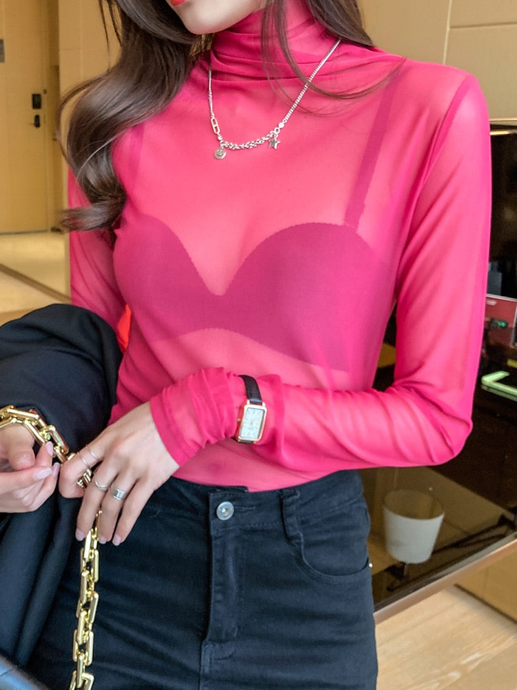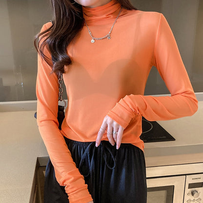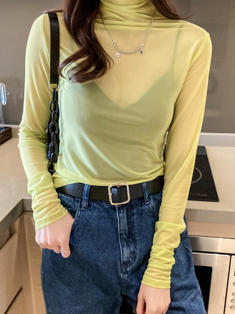 Hulianfu Size M-3XL Girls Colorful Mesh T-Shirts Tees Female Transparent Long Sleeve Turtleneck Thin Tshirt Tops Women Spring Fall