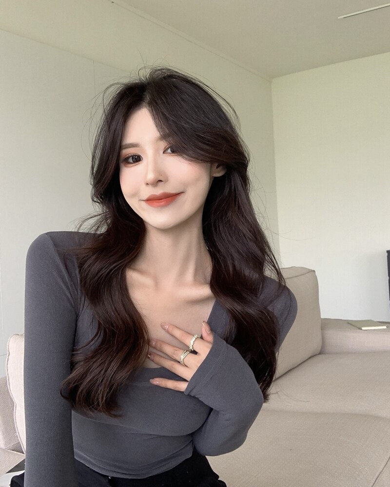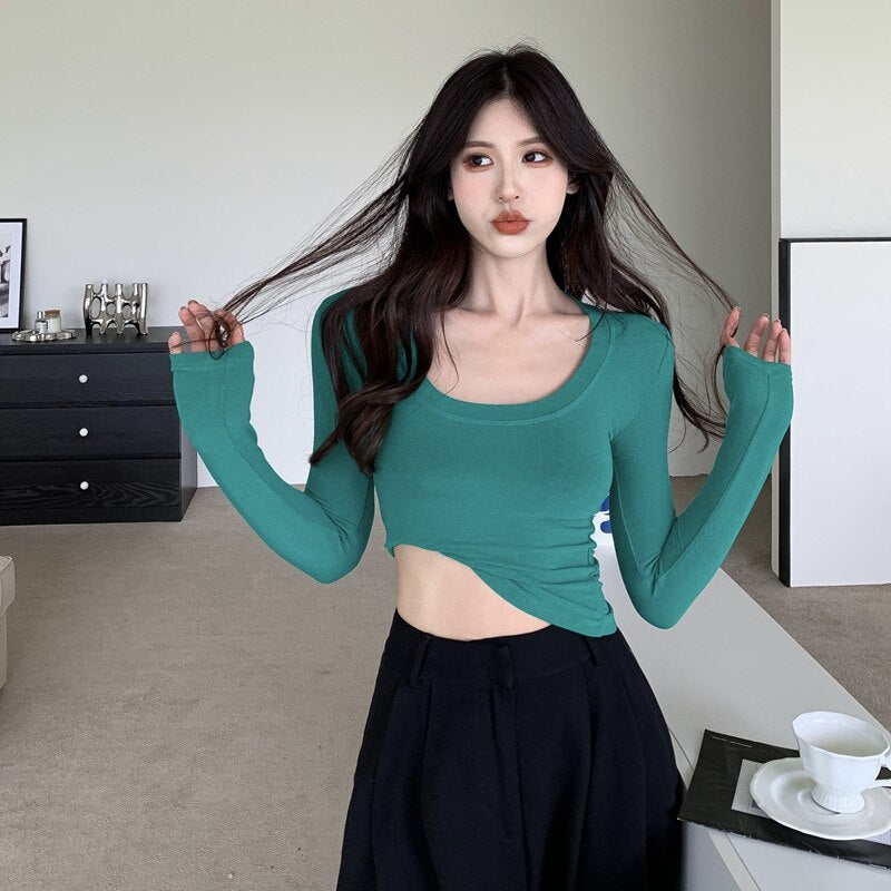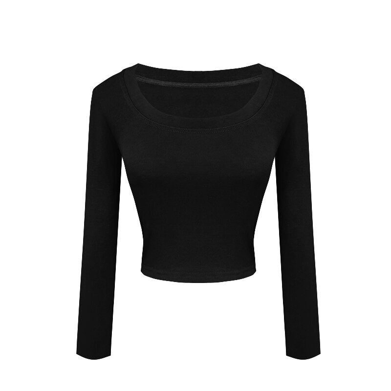 Hulianfu Soft Elastic Tees Women U-neck Cropped T-shirts Girls Full Sleeve Sheath Tshirt Basic Crop Tops Girls Base Undershirts