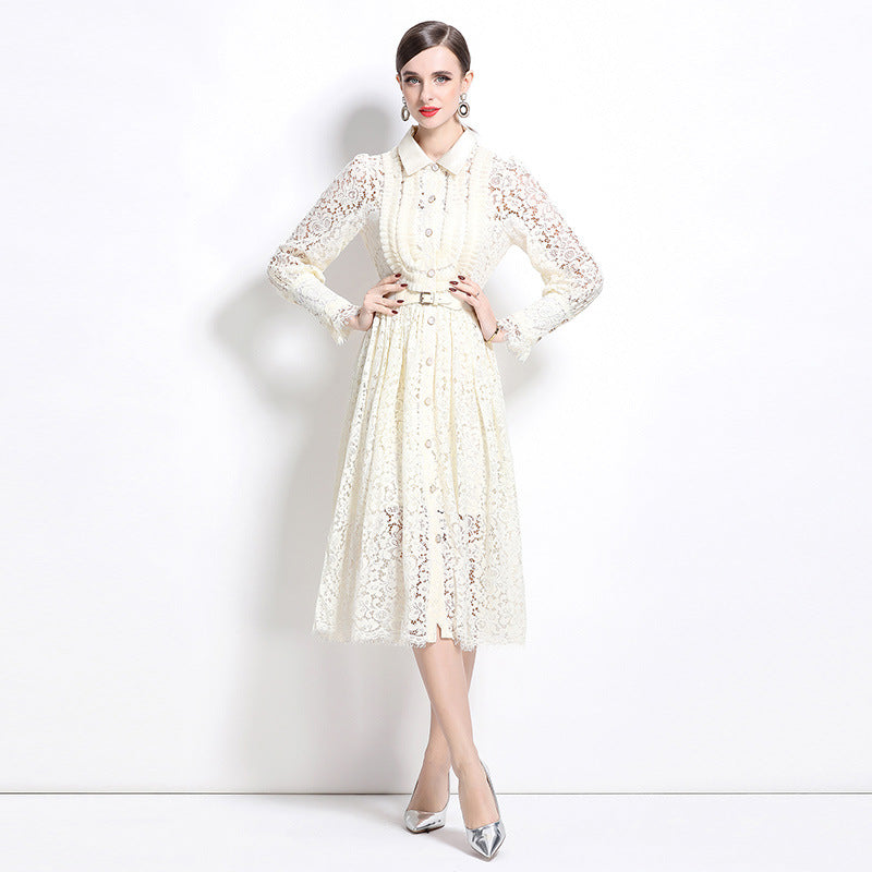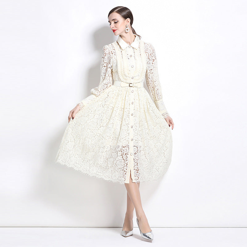 Spring and autumn new lapel heavy industry hook flower hollowed out lace dress women's sexy swinging knee-length skirt