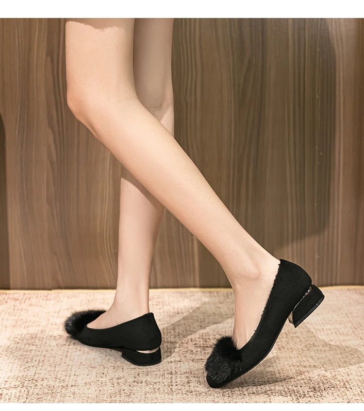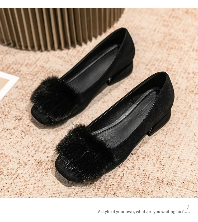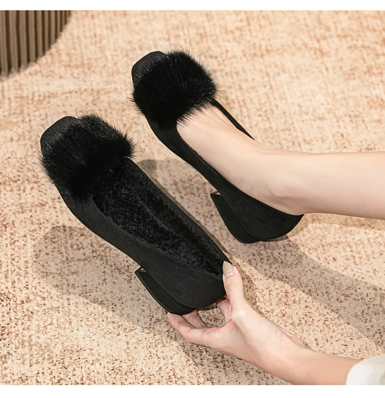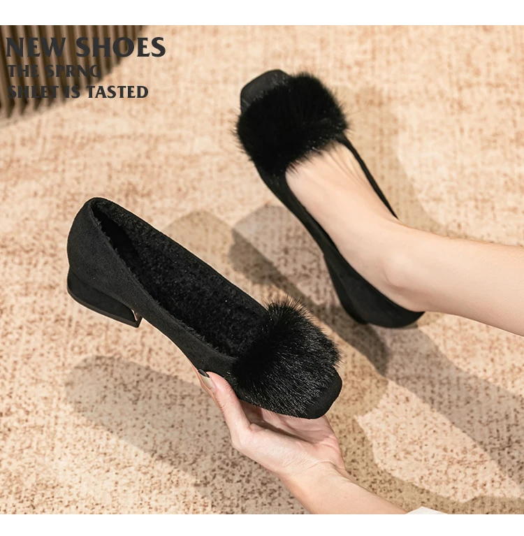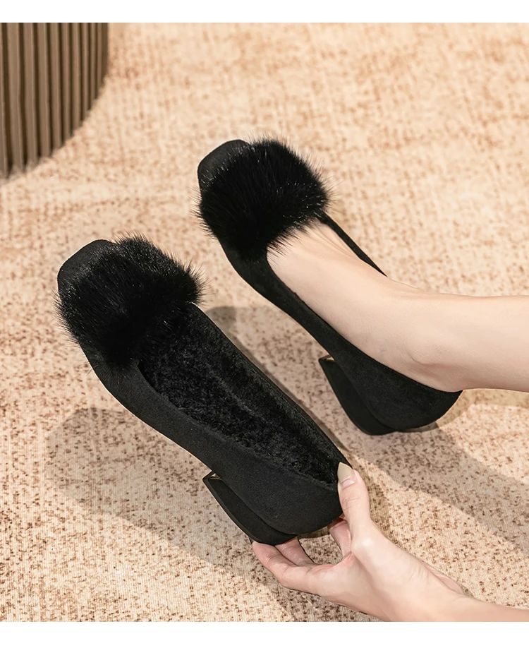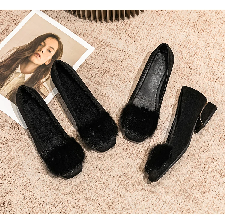 Spring/fall new Black high-heeled women Fashion Korean brand design square head plush low single shoes Free shipping