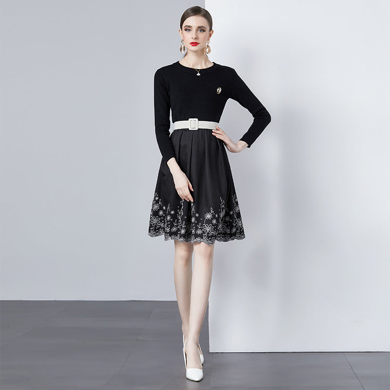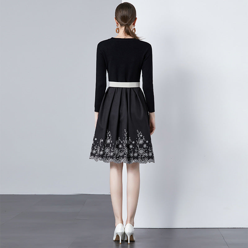 Spring women's clothing popular new black knitted splicing printing pleated dress spring wear high-end sense