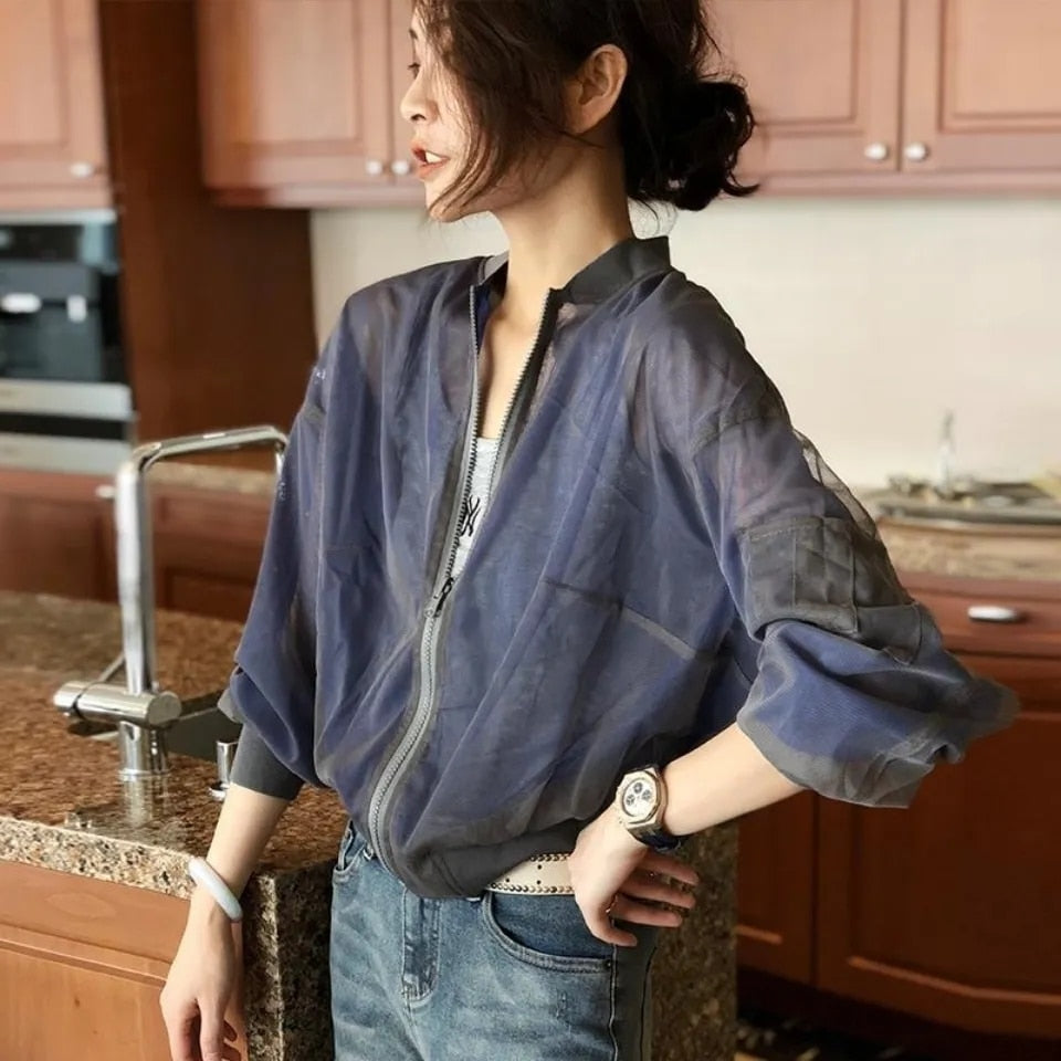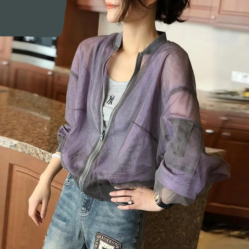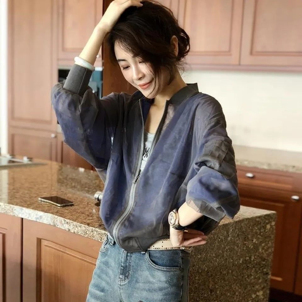 Hulianfu Summer Baseball Gauze Cropped Jacket Women Korean Fashion Lightweight Sun Protection Outerwear Long Sleeve Tops Casual Chaquetas